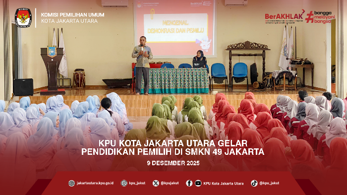 #TemanPemilih, KPU Kota Jakarta Utara gelar Pendidikan Pemilih di SMKN 49 Jakarta pada hari Selasa, 9 Desember 2025. Kegiatan ini bertujuan untuk meningkatkan kesadaran dan partisipasi politik di kalangan pemilih pemula, khususnya siswa/siswi yang telah atau akan memenuhi syarat sebagai pemilih. Hadir sebagai narasumber Anggota KPU Kota Jakarta Utara, Cipto Hardoyo dalam paparannya menekankan pentingnya peran pemilih muda dalam menentukan masa depan bangsa melalui Pemilu. Materi yang disampaikan meliputi, Tata Cara Pemungutan dan Penghitungan Suara, pentingnya menjadi pemilih cerdas, Asas-asas Pemilu, dan Tahapan Pemilu. #KPUMelayani #KPUJakut ....