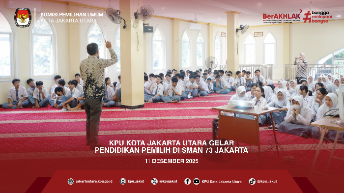 #TemanPemilih, KPU Kota Jakarta Utara kembali menggelar Pendidikan Pemilih di SMAN 73 Jakarta pada kamis, 11 Desember 2025. Kegiatan ini bertujuan khusus untuk mengedukasi para pemilih pemula, yang sebentar lagi akan menggunakan hak pilihnya, agar dapat berpartisipasi secara aktif dan bertanggung jawab dalam proses demokrasi. Sosialisasi ini disampaikan langsung oleh Ketua KPU Kota Jakarta Utara, Bapak Abdul Bahder Maloko. Dalam paparannya, beliau menekankan bahwa memilih bukan sekadar hak, tetapi juga tanggung jawab moral untuk menentukan pemimpin dan kebijakan publik di masa depan. "Siswa-siswi SMAN 73, sebagai generasi muda, harus menjadi motor penggerak perubahan. Jadilah pemilih yang cerdas. Kenali calonnya, pahami programnya, dan jangan pernah golput. Partisipasi Anda sangat menentukan arah pembangunan bangsa," tegas Bahder. #KPUMelayani #KPUJakut ....