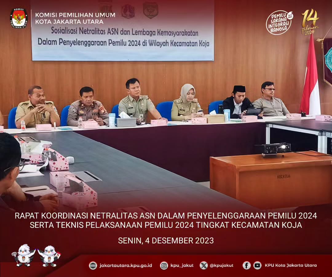 Dihadiri oleh Anggota KPU Kota Jakarta Utara Bpk. Abie Maharullah Madugiri, Bawaslu Kota Jakarta Utara, Camat Koja, Kapolsek Koja, Danramil Koja, Kasatpol PP Koja, dan Lurah se-Kecamatan Koja.