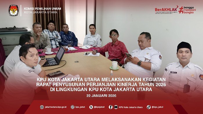 #TemanPemilih, KPU Kota Jakarta Utara menggelar rapat penting terkait penyusunan Perjanjian Kinerja Tahun 2026. Kegiatan ini berlangsung pada Kamis (22/1/2026) bertempat di Ruang Rapat Kantor KPU Kota Jakarta Utara.