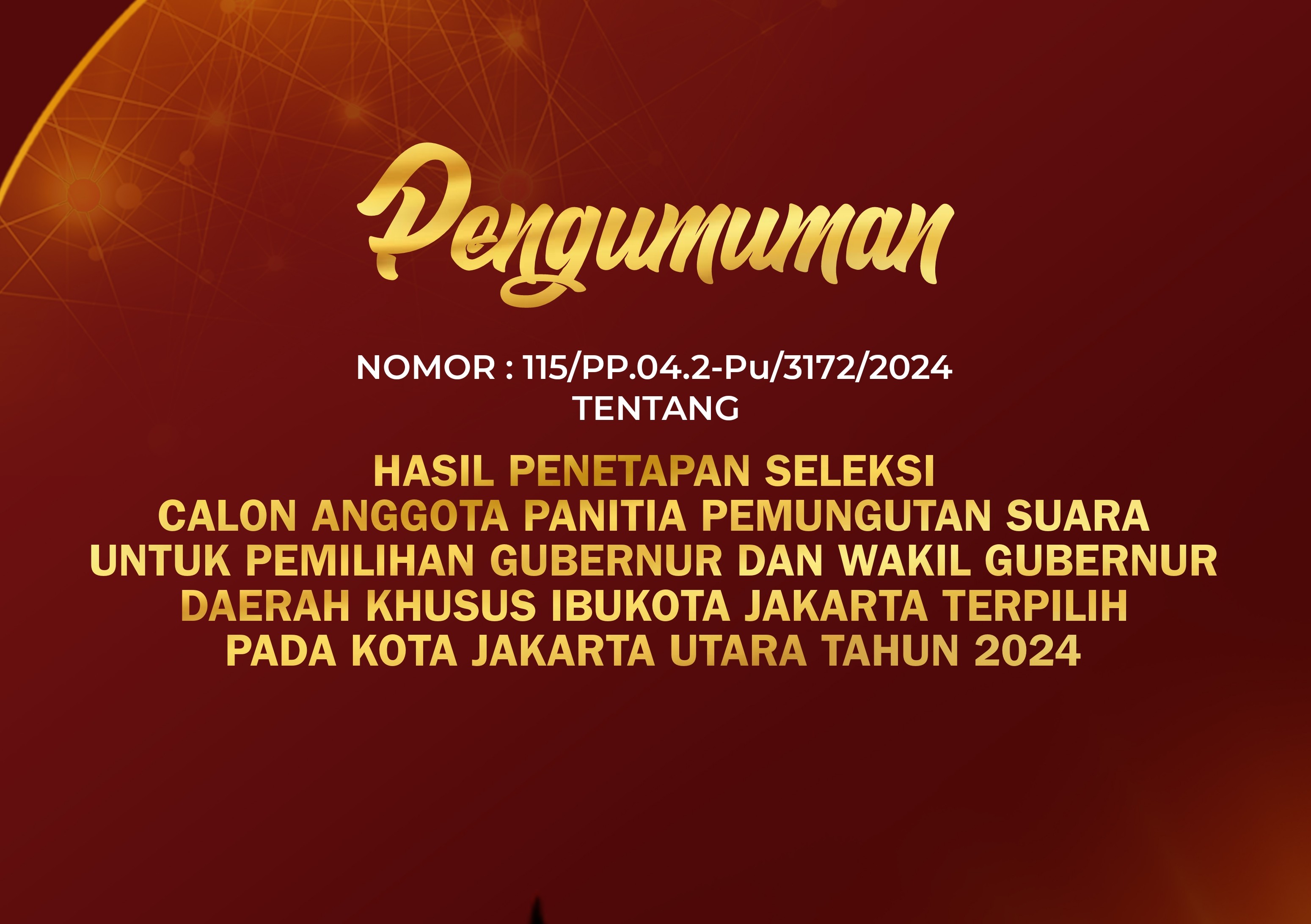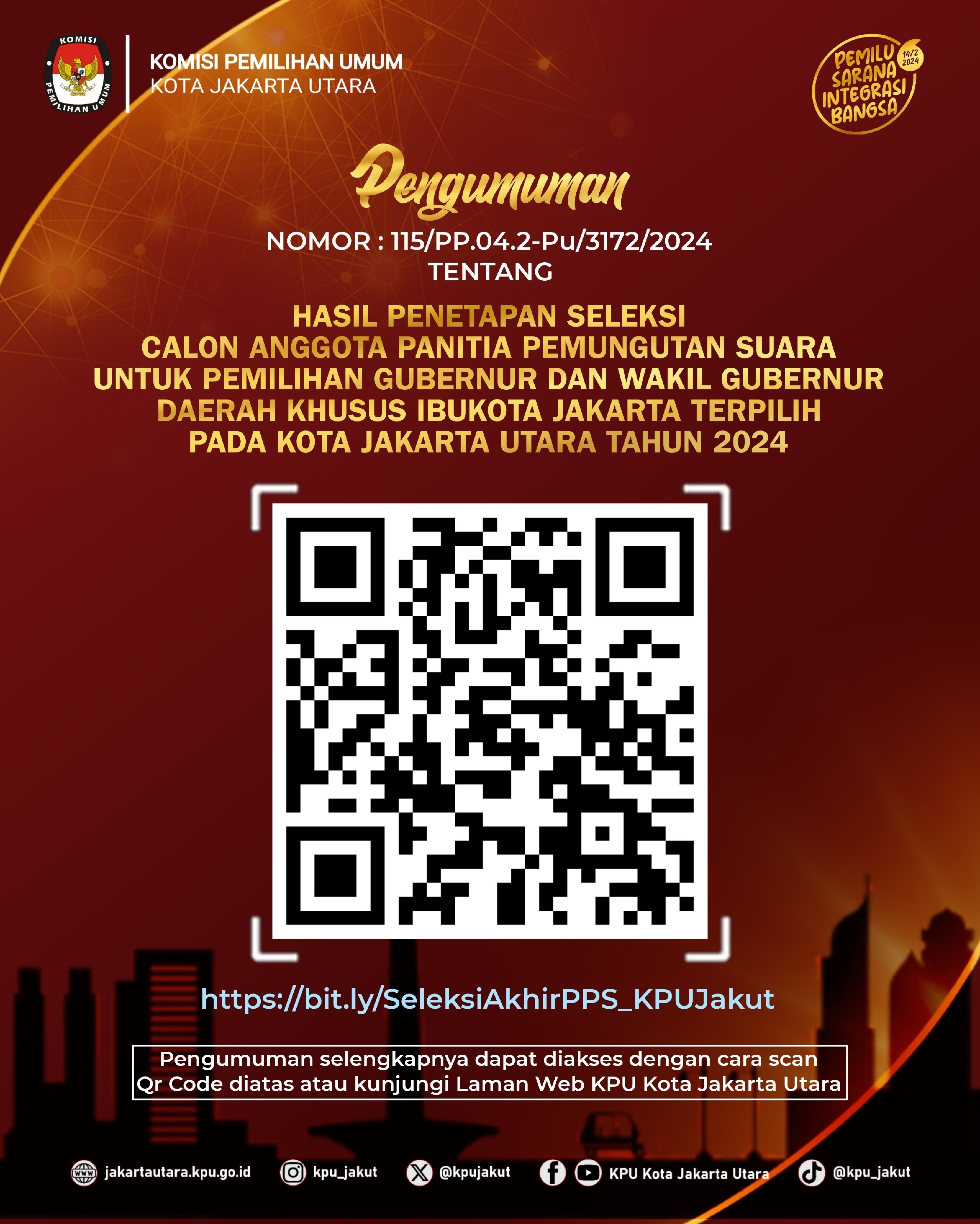 #TemanPemilih berikut Pengumuman Nomor 96/PP.04.2-Pu/3172/2024 Tentang Hasil Penetapan Seleksi Calon Anggota Panitia Pemungutan Suara Untuk Pemilihan Gubernur dan Wakil Gubernur Provinsi DKI Jakarta Pada Kota Jakarta Utara Tahun 2024.