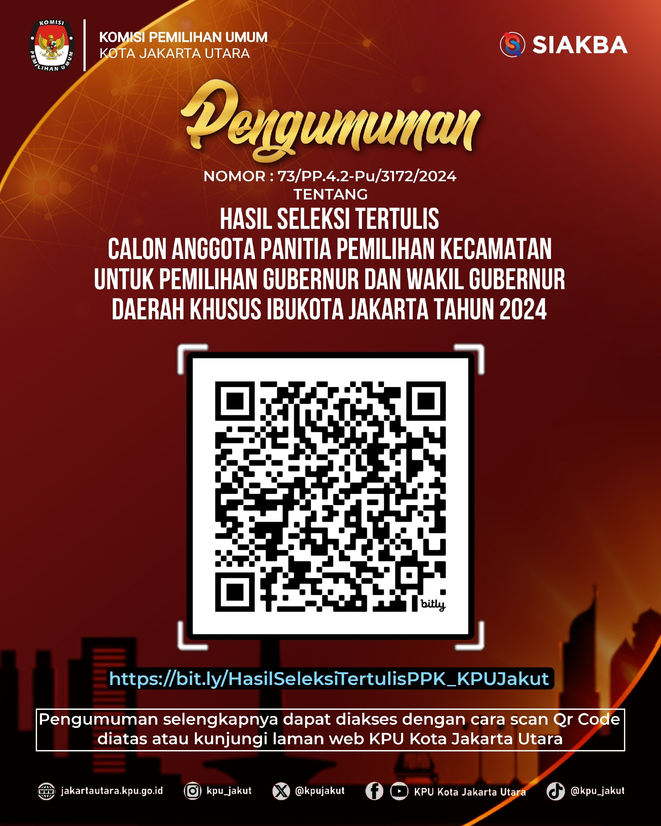 #TemanPemilih berikut Pengumuman Nomor 73/PP.04.2-Pu/3172/2024 Tentang Hasil Seleksi Tertulis Calon Anggota Panitia Pemilihan Kecamatan Untuk Pemilihan Gubernur dan Wakil Gubernur Provinsi DKI Jakarta Pada Kota Jakarta Utara Tahun 2024.