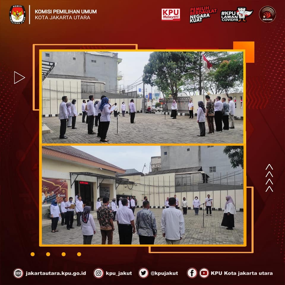 Apel dihadiri Ketua, Anggota, Sekretaris, Kasubbag dan Staf sekretariat di halaman kantor KPU Kota Jakarta Utara, Senin (13/6).