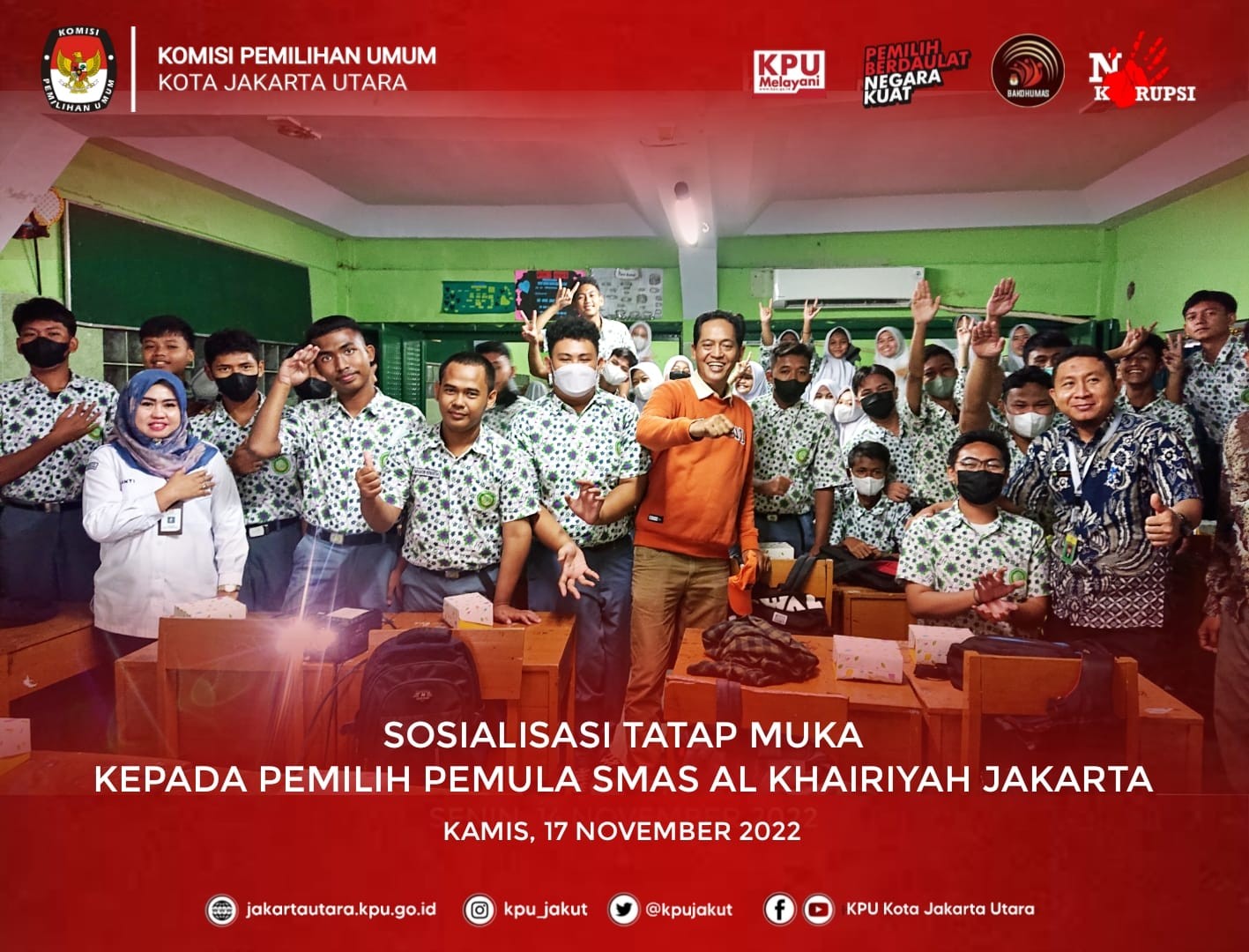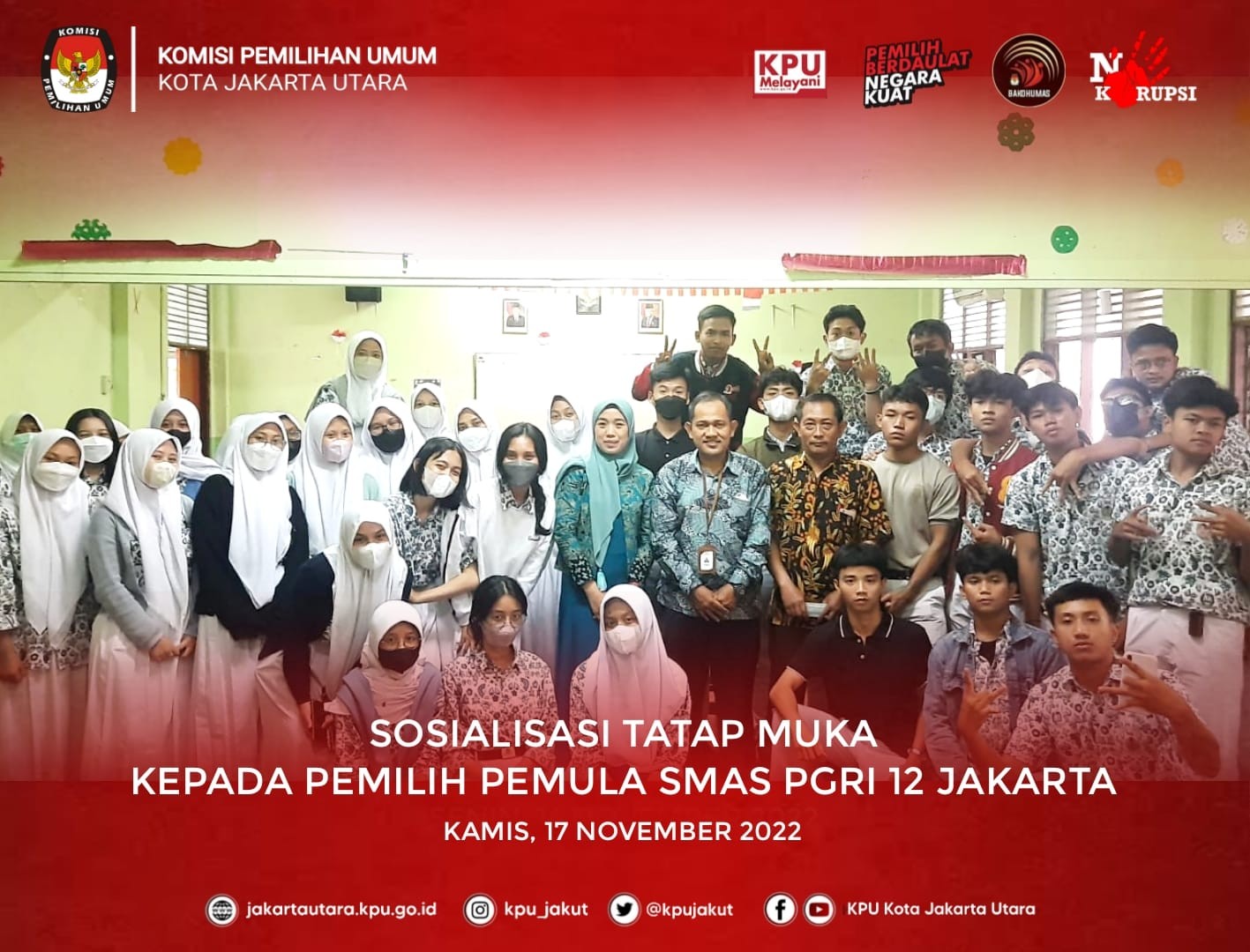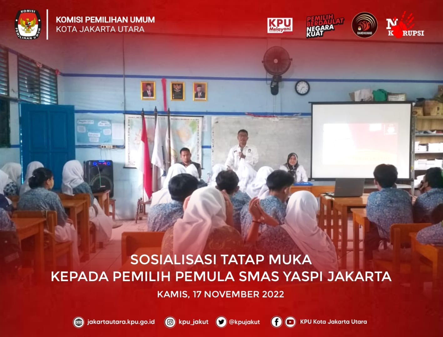 Sosialisasi Tatap Muka kepada Pemilih Pemula yang dilaksanakan serentak pada Kamis, 17 November 2022 Pukul 7.30 WIB s/d selesai di 3 Sekolah yakni SMAS Yaspi, SMAS Al Khairiyah Jakarta dan SMAS PGRI 12 Jakarta.