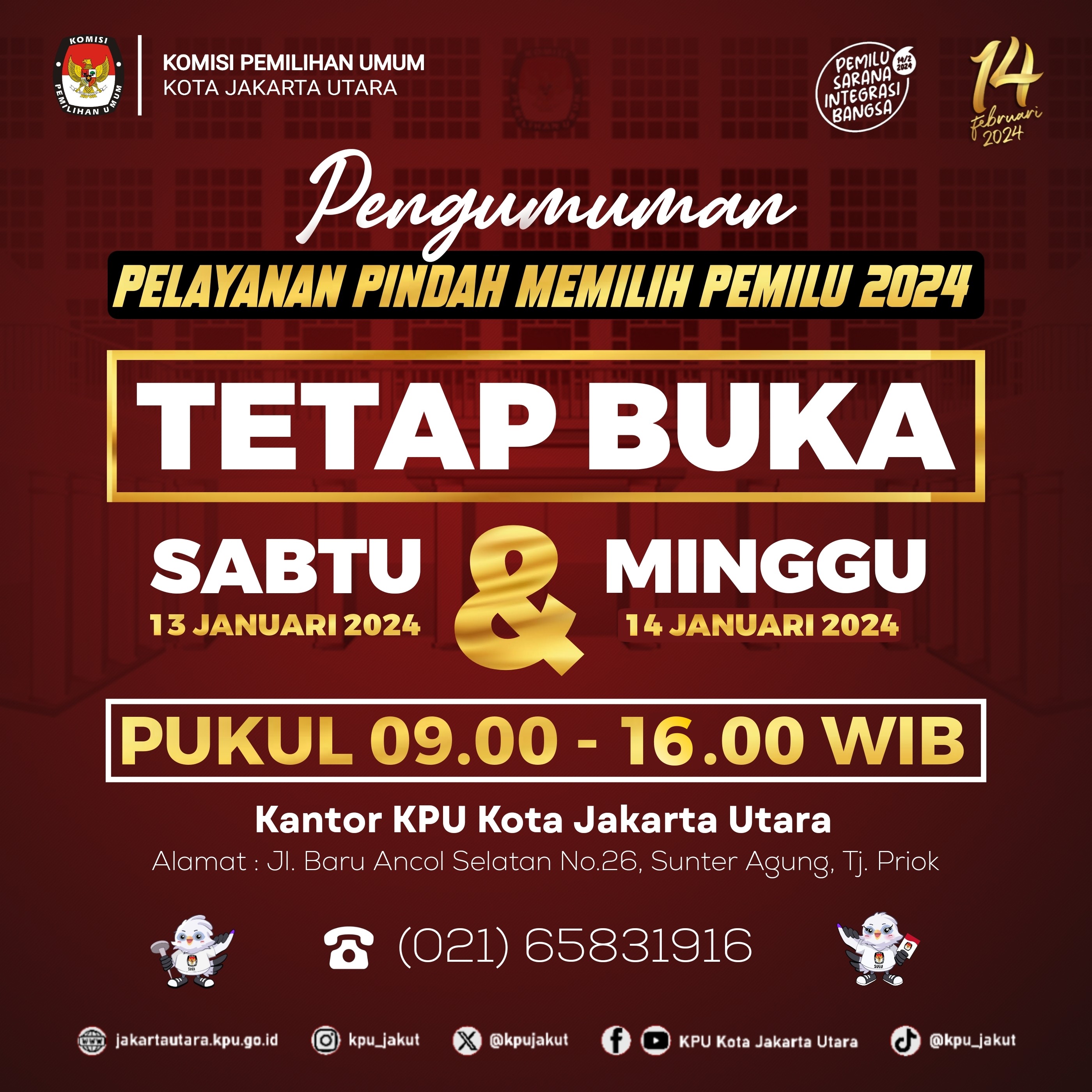 hai #TemanPemilih , warga KPU Kota Jakarta Utara, untuk mengurus Pindah Memilih tetap buka pada hari Sabtu tanggal 13 Januari 2024 dan Minggu 14 Januari 2024, mulai pukul 09.00 WIB s/d 16.00 WIB.