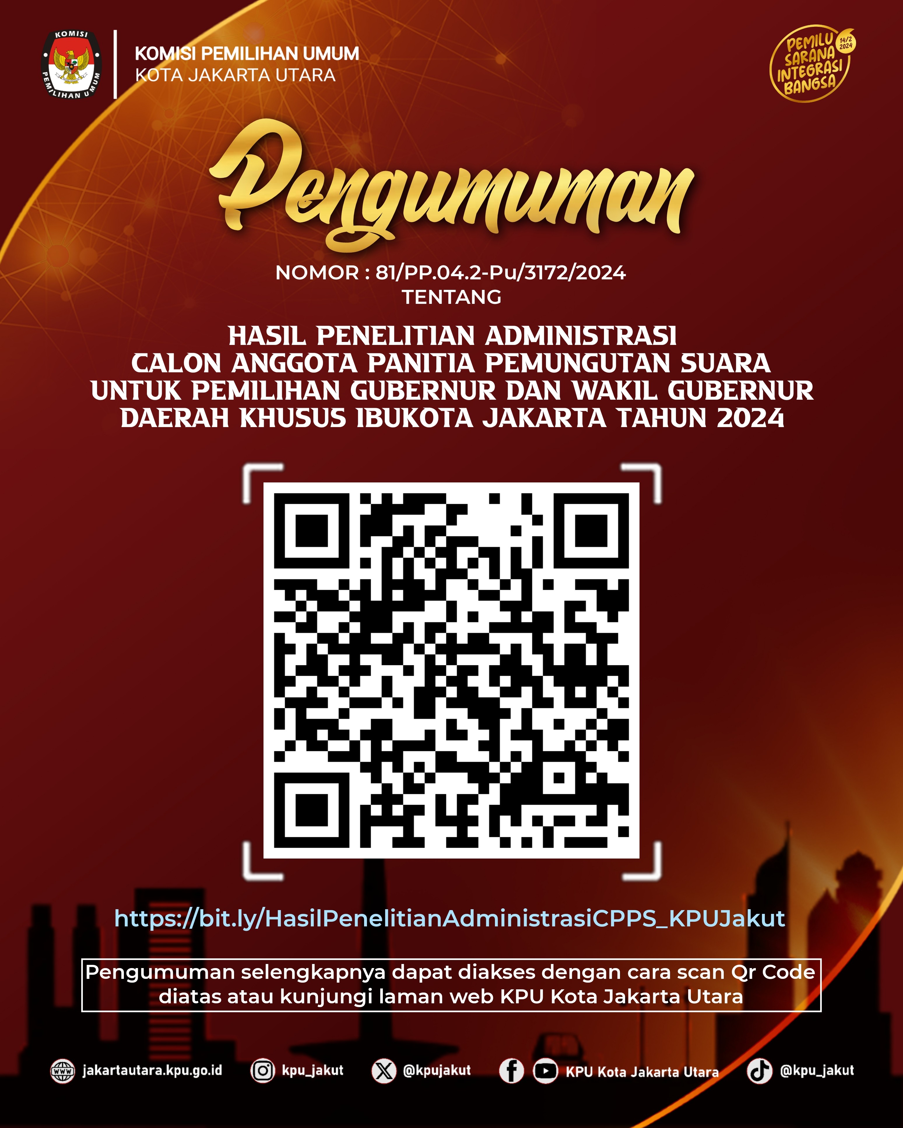 #TemanPemilih berikut Pengumuman Nomor 81/PP.04.2-Pu/3172/2024 Tentang Hasil Penelitian Administrasi Calon Anggota Panitia Pemungutan Suara Untuk Pemilihan Gubernur dan Wakil Gubernur Provinsi DKI Jakarta Pada Kota Jakarta Utara Tahun 2024.