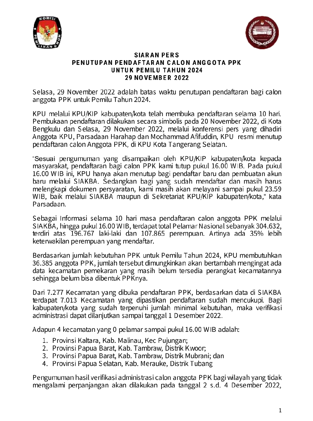 Siaran Pers Penutupan Pendaftaran Calon Anggota PPK Untuk Pemilu Tahun 2024