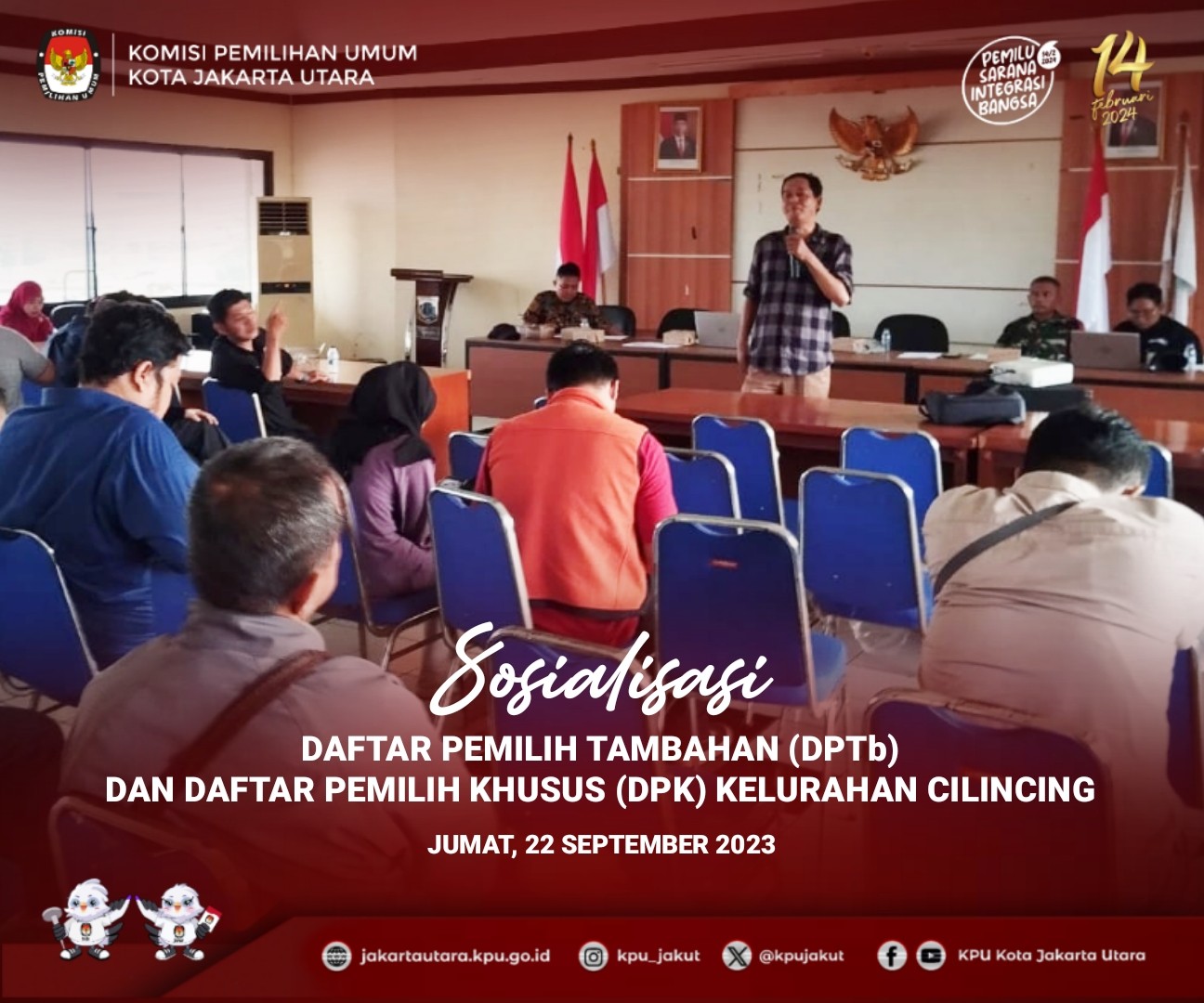 #TemanPemilih KPU Kota Jakarta Utara melakukan Sosialisasi DPTb dan DPK di Kelurahan Cilincing, pada hari Jumat, 23 September 2023 pukul 14.00 WIB s.d selesai yg bertempat di Kantor Kelurahan Cilincing.