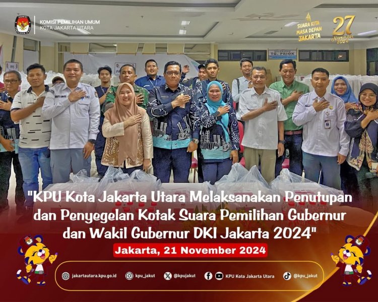 #TemanPemilih, KPU Kota Jakarta Utara Melaksanakan Penutupan dan Penyegelan Kotak Suara Pemilihan Gubernur dan Wakil Gubernur DKI Jakarta Tahun 2024 pada tanggal 21 November 2024 di Kecamatan Tanjung Priok, Kecamatan Pademangan, dan Kecamatan Kelapa Gading.