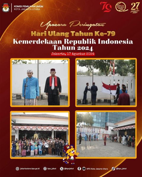 Komisi Pemilihan Umum Kota Jakarta Utara melaksanakan Upacara Menyambut Hari Ulang Tahun Ke-79 Kemerdekaan Republik Indonesia Tahun 2024. pada Hari Sabtu, 17 Agustus 2024 di Kantor KPU Kota Jakarta Utara.