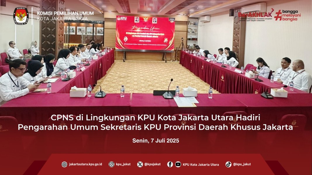 #TemanPemilih CPNS di lingkungan KPU Kota Jakarta Utara menghadiri Pengarahan Umum Sekretaris KPU Provinis Daerah Khusus Jakarta kepada Calon Pegawai Negeri Sipil (CPNS) yang baru bergabung di lingkungan KPU Provinsi dan KPU Kabupaten/Kota se-Provinsi Daerah Khusus Jakarta, di Kantor KPU Provinsi Daerah Khusus Jakarta, pada Senin, (7/7).