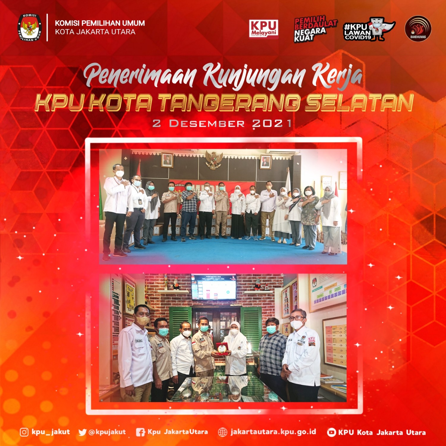 Kamis, 2 Desember 2021 Pukul 10.00 Wib Jajaran Komisioner dan Sekretariat KPU Kota Jakarta Utara menerima kunjungan Ketua, Anggota dan Sekretariat KPU Kota Tangerang Selatan. Kunjungan diawali dengan pembukaan dan perkenalan Jajaran KPU Kota Jakarta Utara oleh Plh. Ketua Arif Budianto, Ketua KPU Kota Tangerang Selatan M.Taufiq MZ menyampaikan maksud kunjungannya beserta jajaran yg ingin berbagi pengalaman dalam pengelolaan badan Ad Hoc terutama berkaitan dengan pelanggaran dan kode etik Penyelenggara Pemilu pada Pemilu 2019 di lingkungan KPU Kota Jakarta Utara, hal tersebut dipaparkan langsung oleh Ibnu Affan selaku Kepala Divisi Hukum dan Pengawasan kemudian dilanjutkan dengan pemaparan oleh Muhammad Yusran selaku sub Koordinator Hukum KPU Kota Jakarta Utara, Ketua KPU Kota Tangerang Selatan M. Taufiq MZ sangat mengapresiasi penanganan pelanggaran kode etik penyelenggara Pemilu dan pengelolaan arsip dokumen hasil Pemilu 2019 di KPU Kota Jakarta Utara, kunjungan diakhiri peninjauan Rumah Pintar Pemilu (RPP) KPU Kota Jakarta Utara.