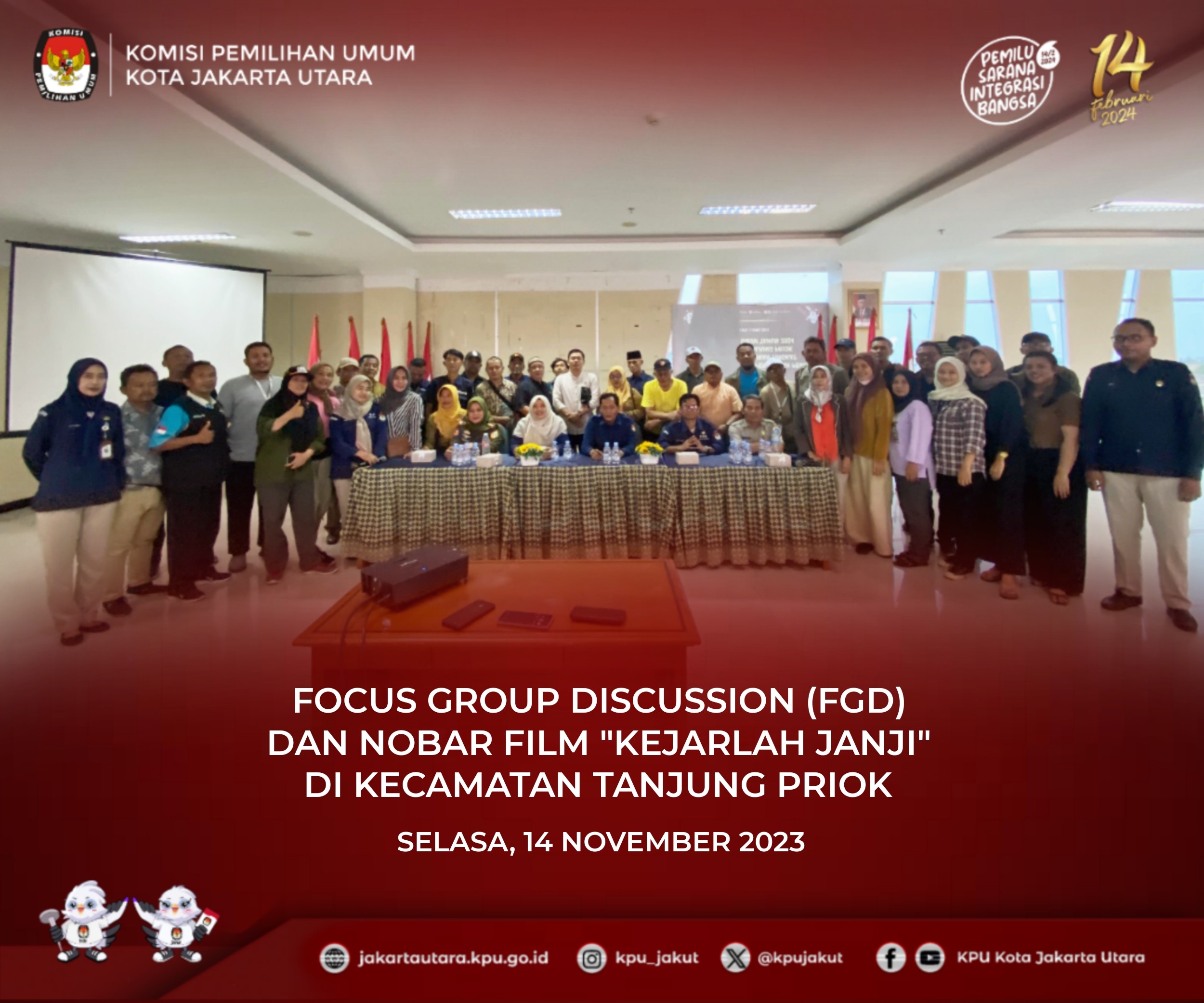 #TemanPemilih KPU Kota Jakarta Utara menghadiri Acara Focus Group Discussiom (FGD) dan Nonton Bareng (Nobar) Film "Kejarlah Janji" bersama PPK, PPS, Ormas/OKP dan Tokoh Masyarakat di Wilayah Kecamatan Tanjung Priok yang diselenggarakan di Kantor Kecamatan Tanjung Priok, Selasa 14 November 2023.
