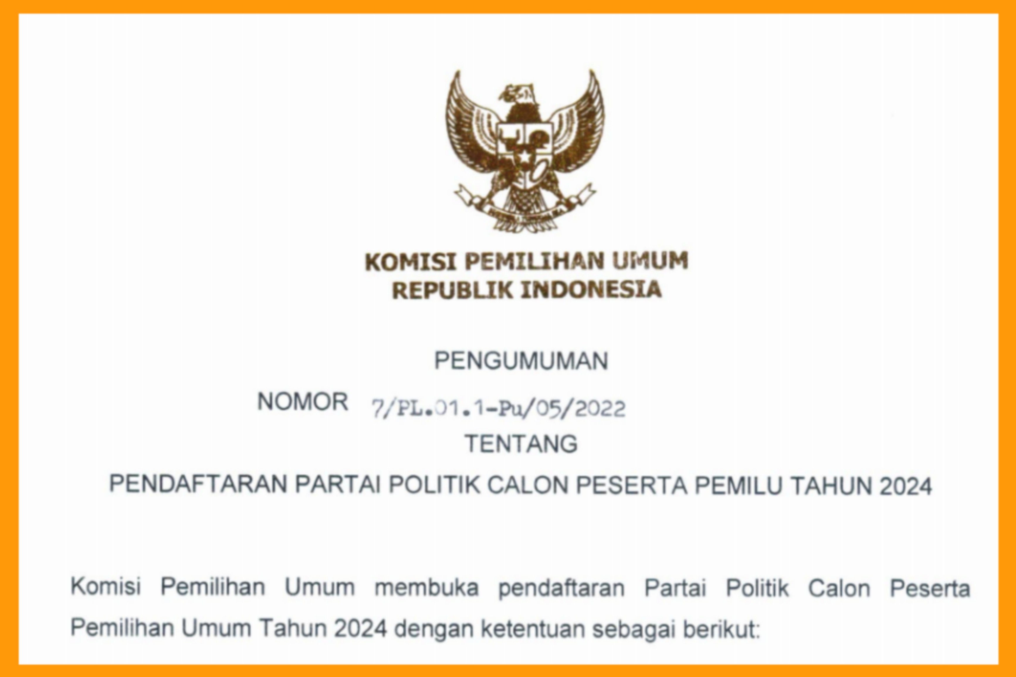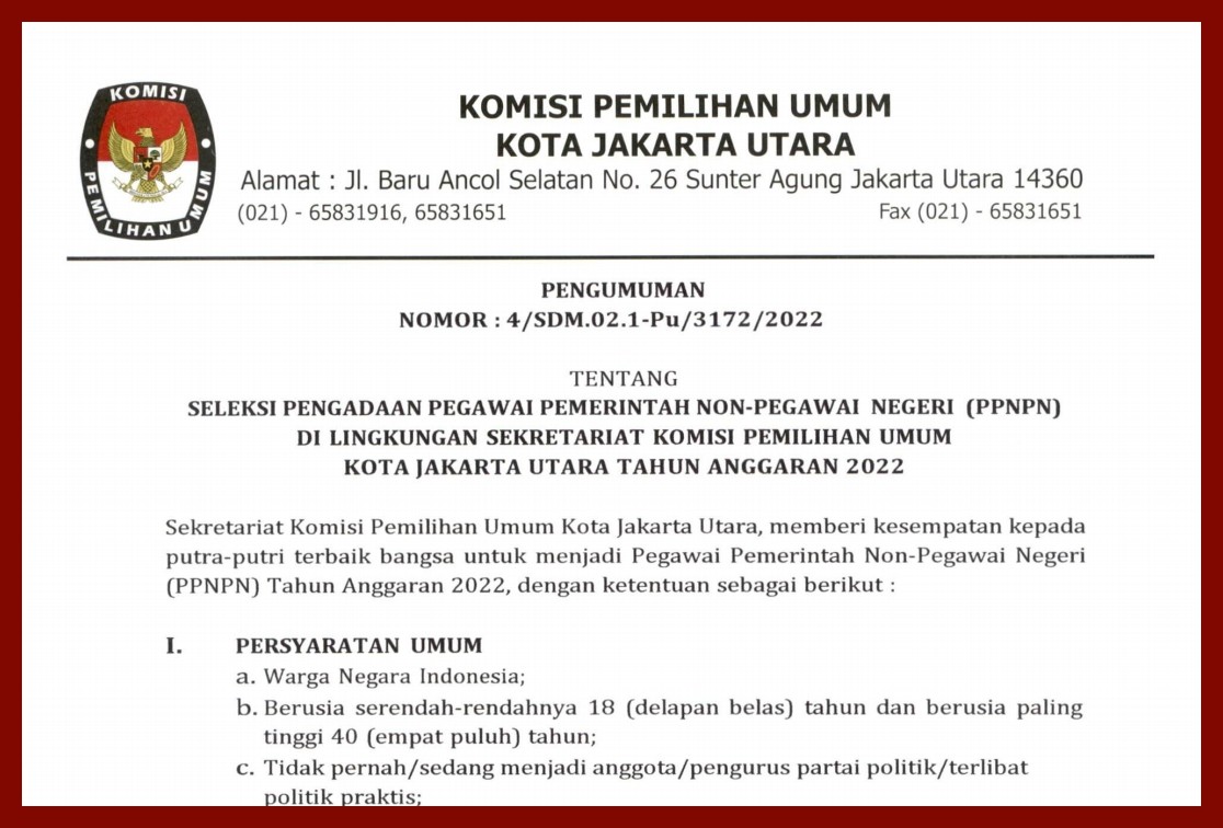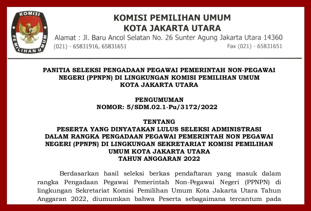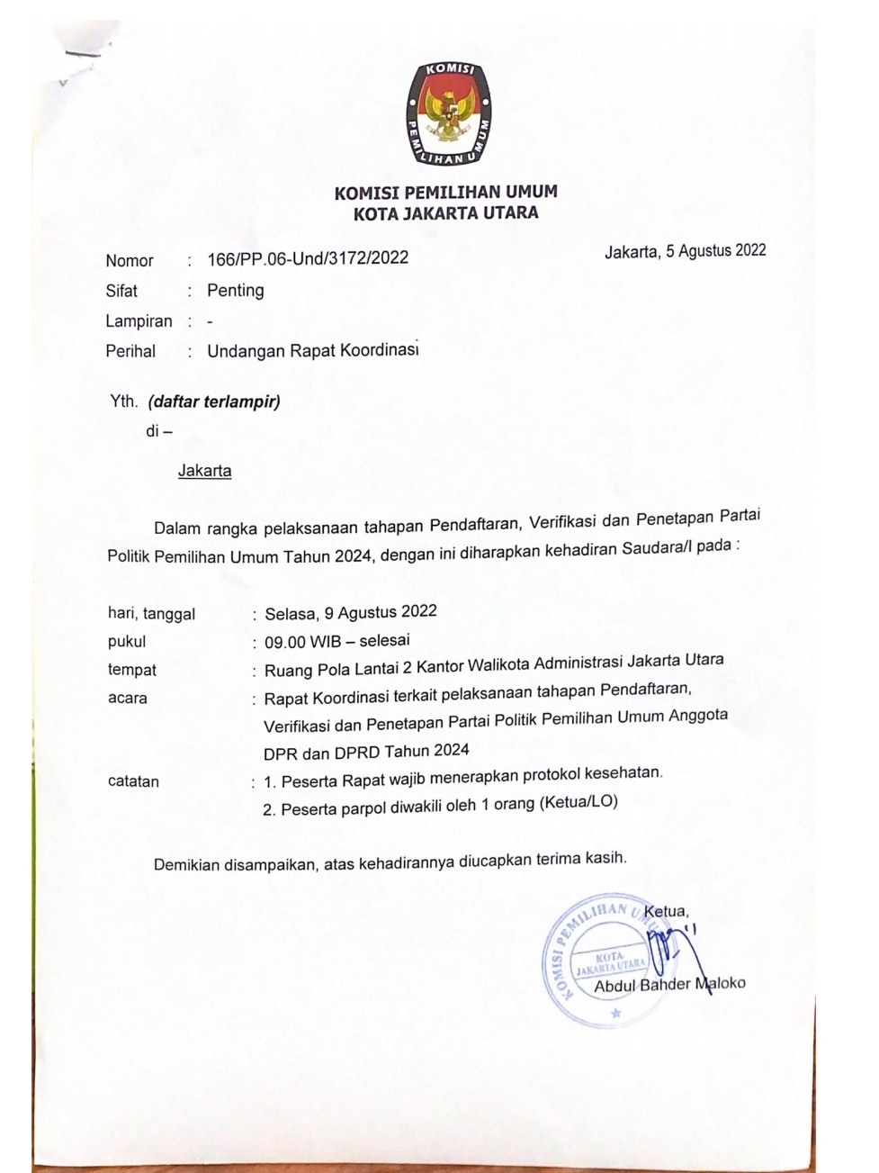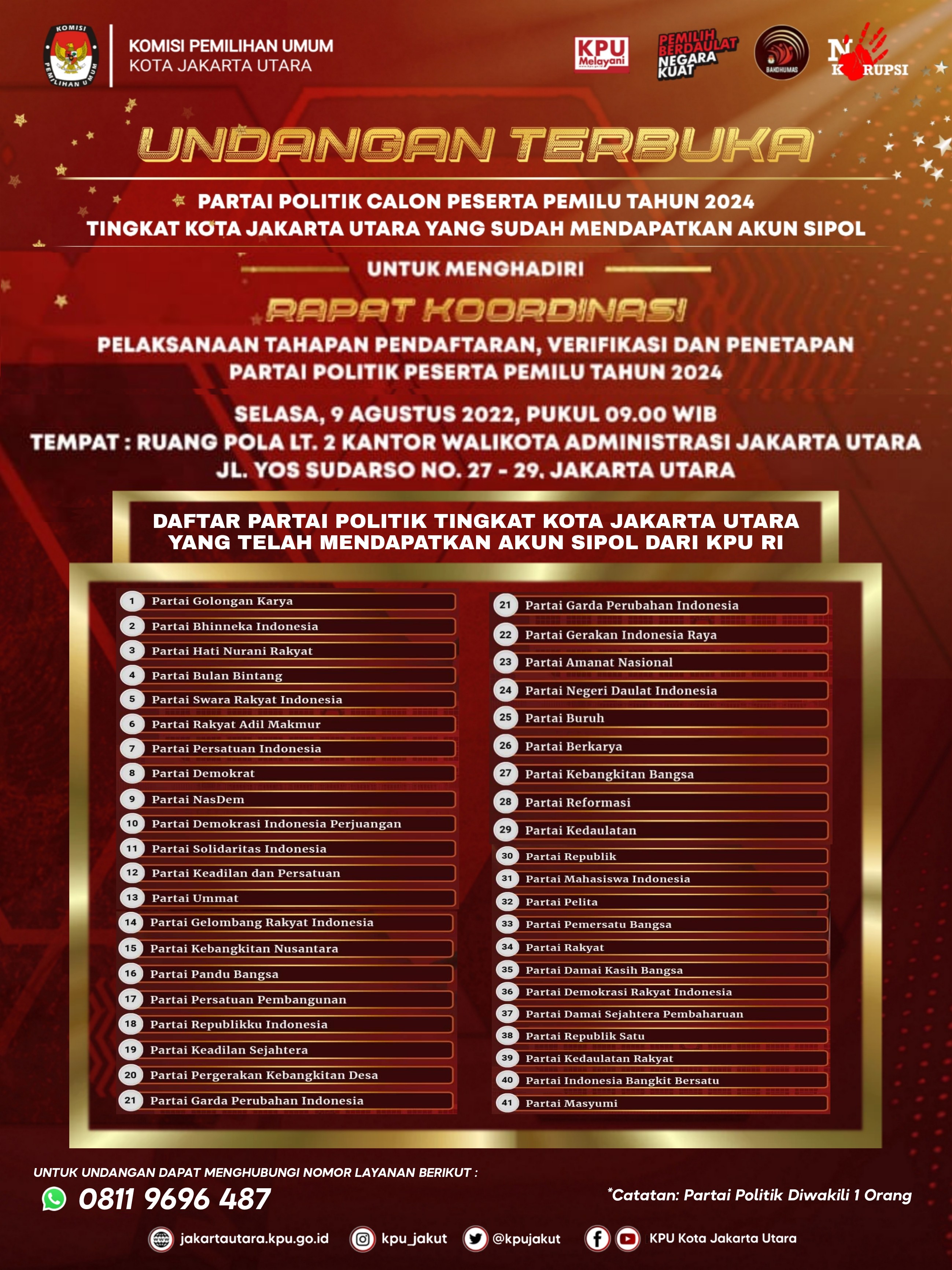 KPU Kota Jakarta Utara mengundang Partai Politik Calon Peserta Pemilu Tahun 2024 tingkat Kota Jakarta Utara yang sudah mempunyai akun SIPOL (Sistem Informasi Partai Politik) dalam acara Rapat Koordinasi Pelaksanaan Tahapan Pendaftaran, Verifikasi dan Penetapan Partai Politik Peserta Pemilu tahun 2024. Yang akan dilaksanakan pada Selasa, 9 Agustus 2022, Pukul 09.00 WIB di Ruang Pola Lt.2 Kantor Walikota Administrasi Jakarta Utara.