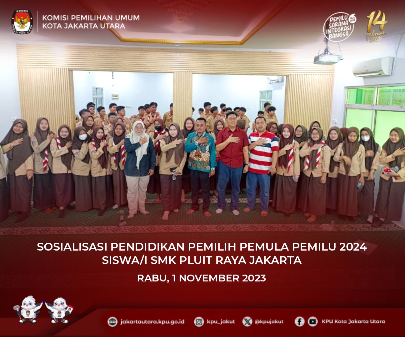 #TemanPemilih KPU Kota Jakarta Utara melakukan Sosialisasi Pendidikan Pemilih Pemula Pemilu Tahun 2024 di SMK Pluit Raya Jakarta, pada hari Rabu, 1 November 2023 pukul 10.00 WIB s.d selesai yang bertempat di SMK Pluit Raya Jakarta.