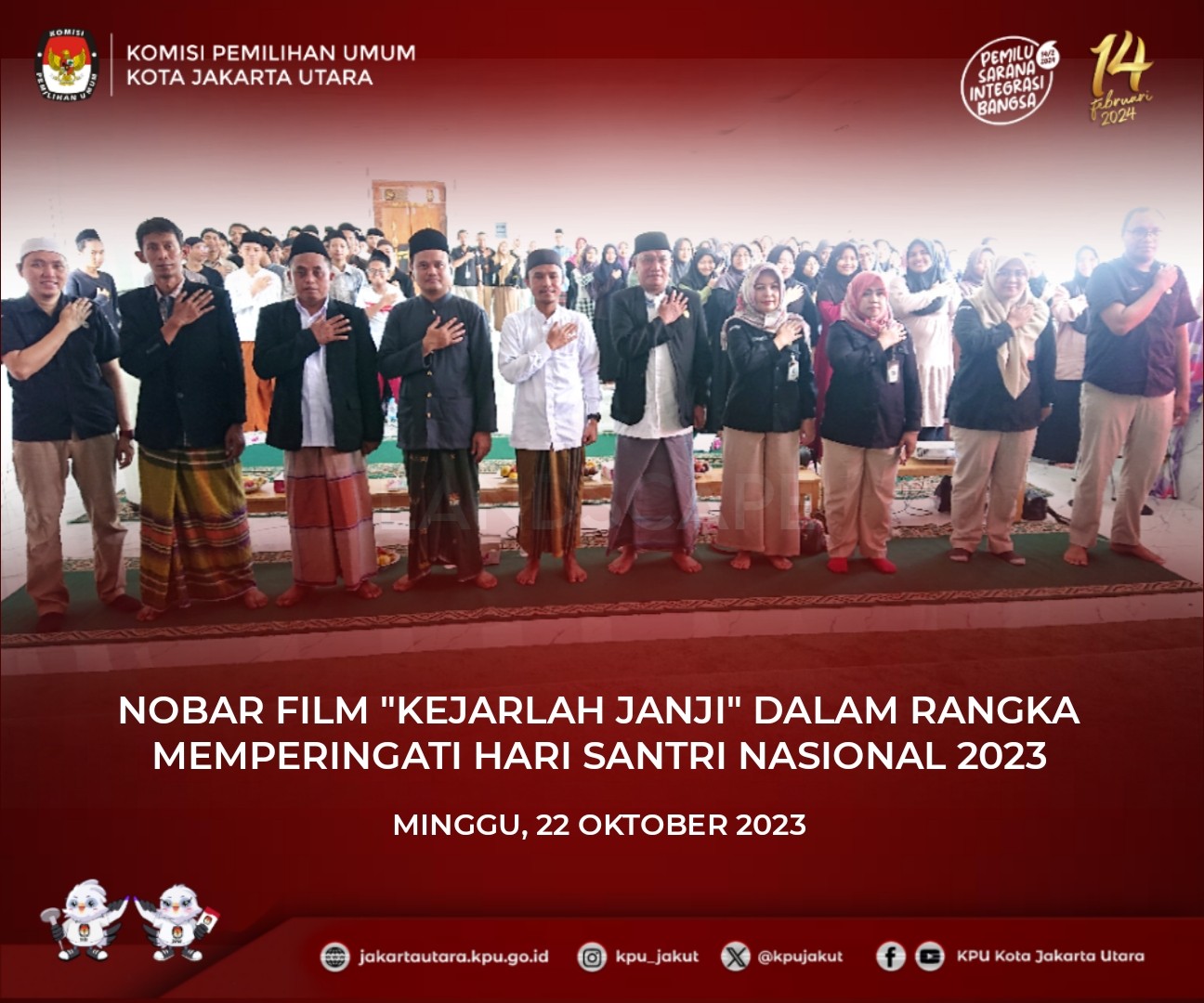 #TemanPemilih KPU Kota Jakarta Utara menggelar acara Nonton Bareng (Nobar) Film "Kejarlah Janji" dalam rangka memperingati Hari Santri Nasional 2023, pada hari Minggu 22 Oktober 2023 pukul 13.00 WIB s.d selesai, yang bertempat di Pondok Pesantren Khairul Ummah Kelurahan Kapuk Muara kec. Penjaringan Jakarta Utara. Acara dibuka oleh Ketua KPU Kota Jakarta Utara Bpk. Abdul Bahder Maloko, beliau menyampaikan menjadi Santriwan Santriwati menuntut Ilmu di Pondok Pesantren tidak hanya memperoleh ilmu pengetahuan umum maupun agama akan tetapi mendapat Pengetahuan lebih dari belajar di lembaga pendidikan pada umumnya, karena santriwan santriwati diajari dan dibekali prinsip-prinsip : KEIKHLASAN, KESEDERHANAAN, KEMANDIRIAN, KEBEBASAN dan UKHUWAH ISLAMIYAH. Lima hal ini santriwan santriwati ditempa dan dibentuk karakter kepribadiannya menjadi manusia manusia berjiwa pemberani, pegabdi dalam rangka mengisi kemerdekaan bangsa yakni mengambil Peren dan terlibat proses pembangunan bangsa dalam kontek pembangun sumber daya manusia yg berilmu, beriman dan bertaqwa. Hari Santri Nasional yang kita peringati hari ini pada tanggal 22 Oktober 2023 dengan Tema "JIHAD SANTRI JAYAKAN NEGERI" mempertegas bahwa peran dan kontribusi santri tidak hanya mempertahkan kemerdekaan 2 bulan setelah Republik ini di proklamirkan tepatnya pada 22 Oktober 1945 yakni berhadapan dengan tentara NICA tentara sekutu. Akan tetapi terus berkontribusi untuk memajukan bangsa Indonesia. Hal ini perlu diapresiasi oleh Negara dalam bentuk menetapkan setiap tgl 22 Oktober, sebagai Hari Santri Nasional. Jihad harus dijadikan sebagai sugesti penyemangat yg tetap bergelora dalam diri dalam rangka mengisi kemerdekaan, secara konseptual Jihad tidak selalu dimaknai atau identik dengan berperang mengangkat senjata, maka tugas berat santriwan santriwati dengan semangat Jihad mengisi kemerdekaan itu adalah berpartisipasi aktif dalam pemilu paling tidak menggunakan hak pilihnya dengan cara ikut dan wajib hadir di TPS pada Tanggal 14 Februari 2024. Karena melalui Pemilu kita memilih pemimpin-pemimpin bangsa yang akan mengurus negara, melayani rakyatnya selama kurun waktu lima tahun kedepan. Melalui tangan-tangan pemimpin hasil pemilu inilah yang menyusun program kerja dan kebijakan-kebijakan dalam mengelola negara. Semoga dengan Semangat Jihad kesatuan dan persatuan bangsa tetap terjaga sehingga pelaksanaan pemilu 14 Februari 2024 berjalan lancar, aman dan damai. "Ga milih ga Asyik" @kpu_ri# KejarlahJanji #Film