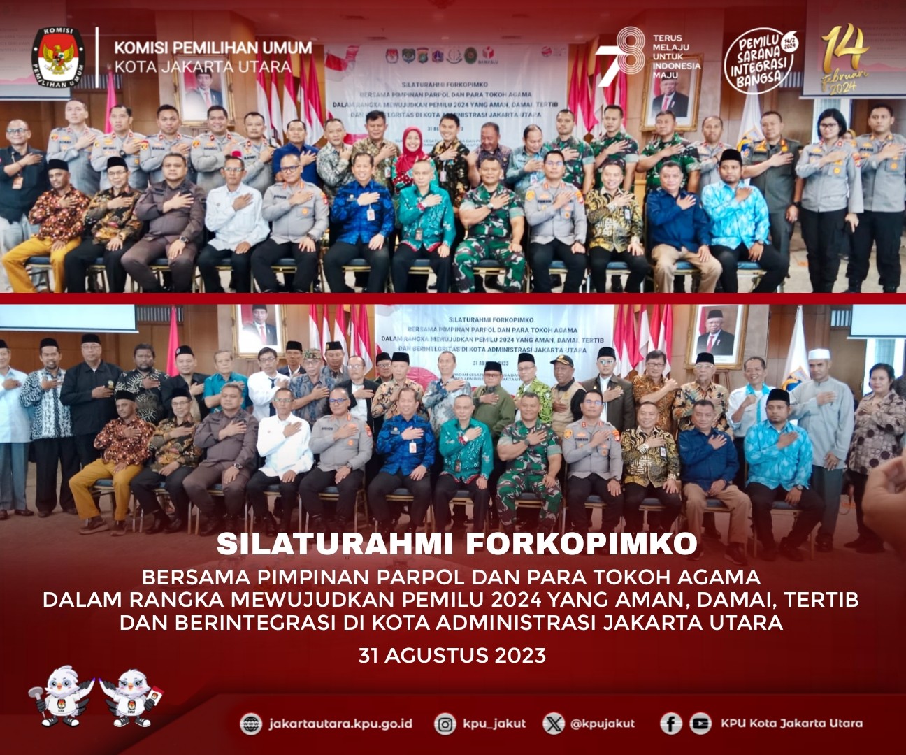 #TemanPemilih KPU Kota Jakarta Utara menghadiri acara Silaturahmi FORKOPIMKO Bersama Pimpinan Parpol dan Para Tokoh Agama Dalam Rangka Mewujudkan Pemilu 2024 Yang Aman, Damai, Tertib dan Berintegrasi di Kota Administrasi Jakarta Utara.