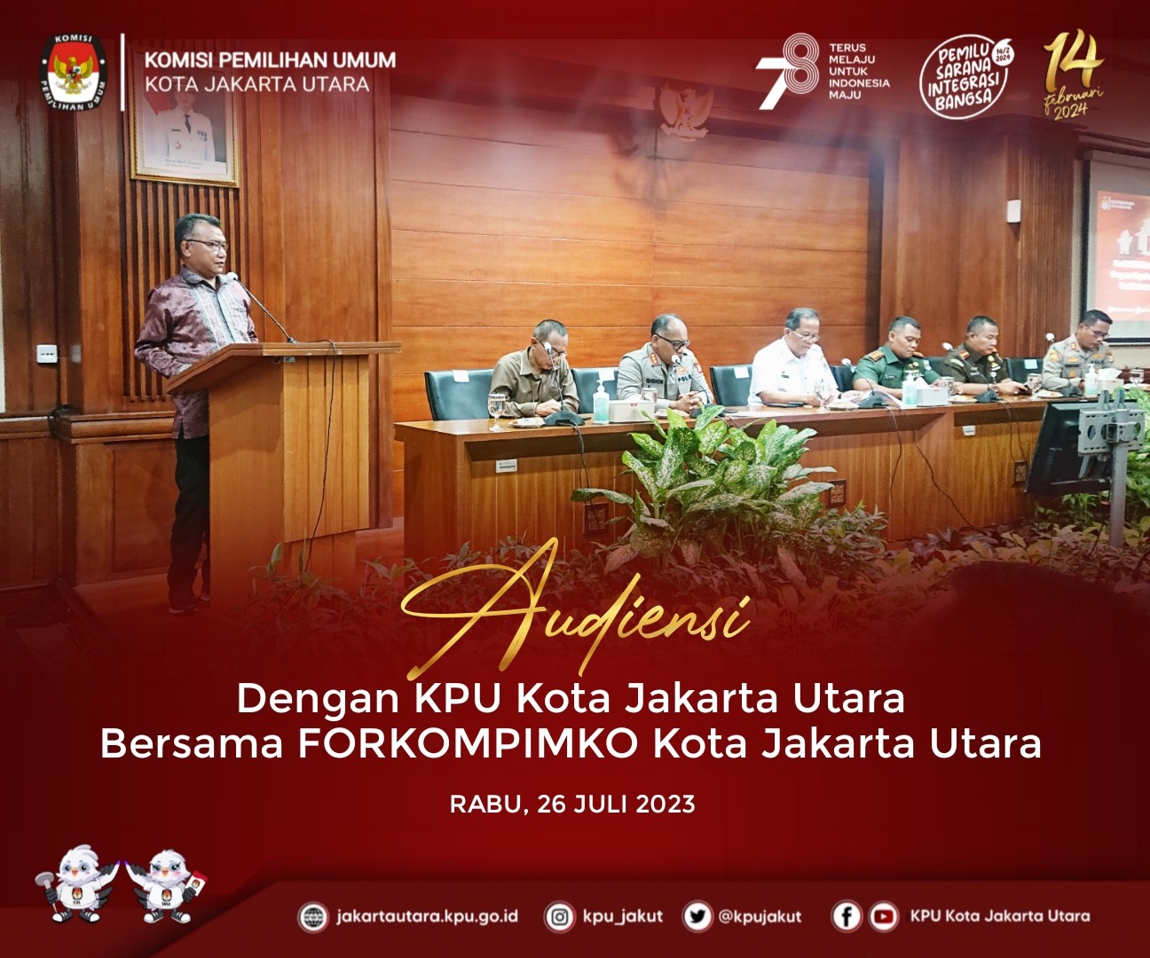 #TemanPemilih KPU Kota Jakarta Utara menggelar audiensi dengan para Jajaran Forum Koordinasi Pimpinan Kota Administrasi Jakarta Utara di Kantor Walikota Kota Adm. Jakarta Utara pada hari, Rabu, 26 Juli 2023 pukul 13.00 WIB s.d selesai.