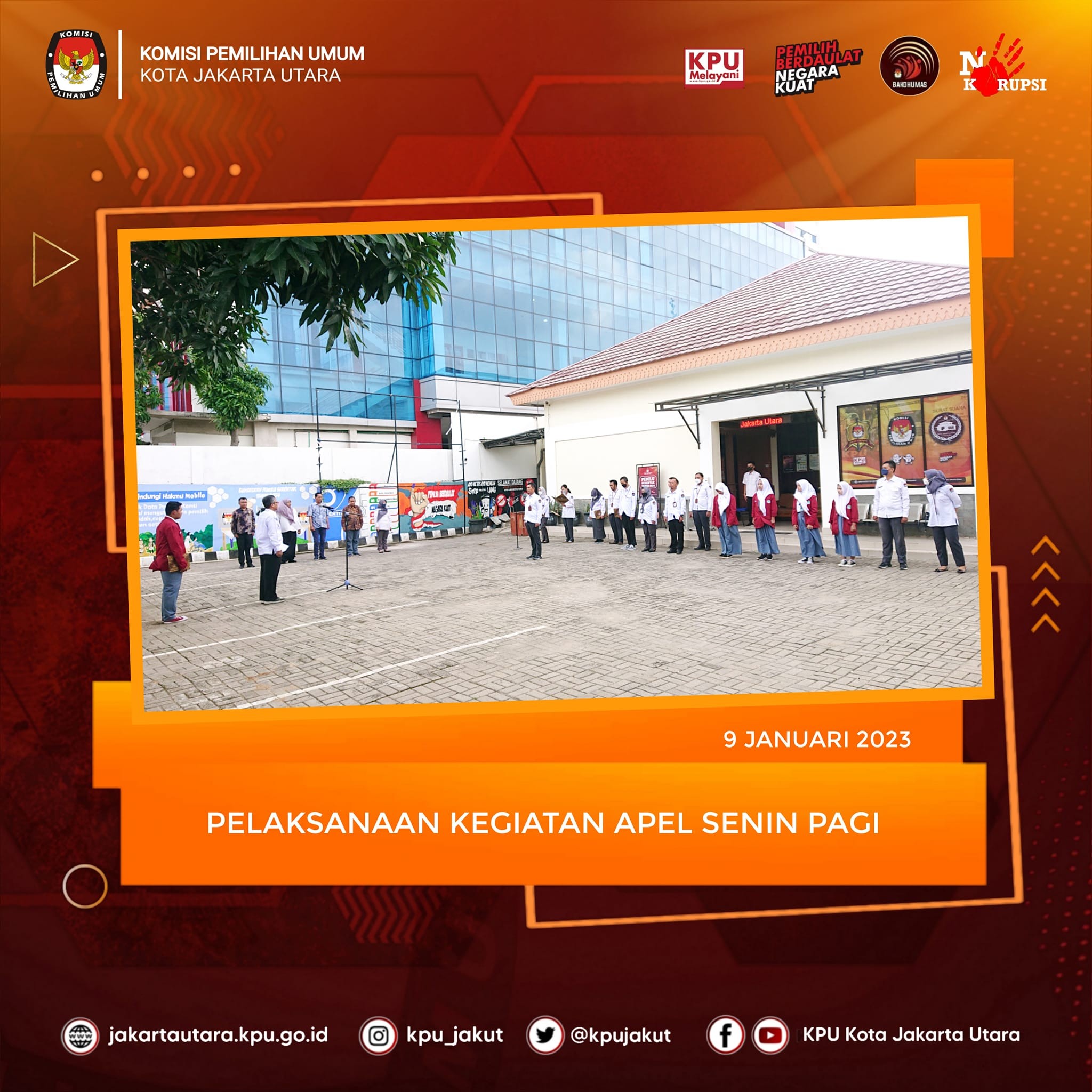 Komisi Pemilihan Umum Kota Jakarta Utara melaksanakan Kegiatan Apel Senin Pagi rutin di halaman kantor KPU Kota Jakarta Utara. Bertindak sebagai Pimpinan apel, Anggota KPU Kota Jakarta Utara, Arif Budianto.