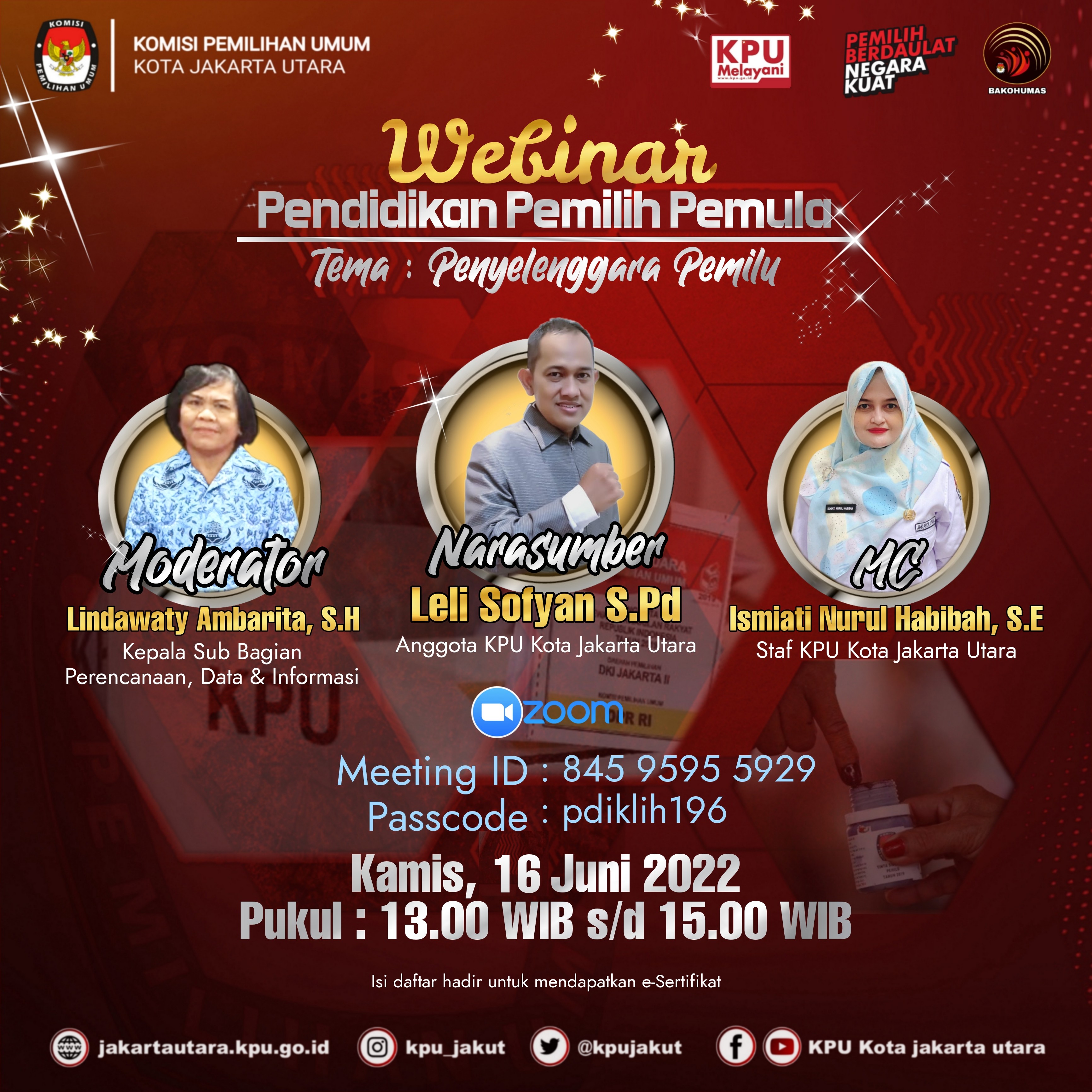 #TemanPemilih KPU Kota Jakarta Utara kembali menyelenggarakan Webinar Pendidikan Pemilih Pemula Sesi Ke-3 pada Kamis, 16 Juni 2022 Pukul 13.00 WIB sd selesai