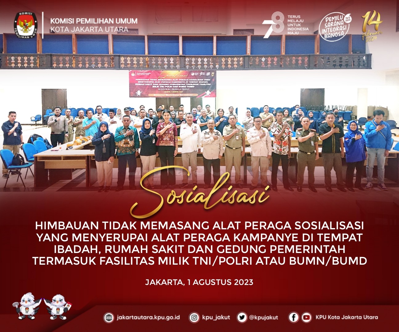 #TemanPemilih KPU Kota Jakarta Utara mengadakan Sosialisasi Himbauan tidak memasang Alat Peraga Sosialisasi yang menyerupai Alat Peraga Kampanye di tempat Ibadah, Rumah Sakit, dan Gedung Pemerintah termasuk Fasilitas milik TNI/POLRI dan BUMN/BUMD sesuai Surat Edaran KPU RI No 765/2023 dan 766/2023, pada Selasa, 1 Agustus 2023 di Gedung Balai Yos Sudarso Kantor Walikota Administrasi Jakarta Utara.