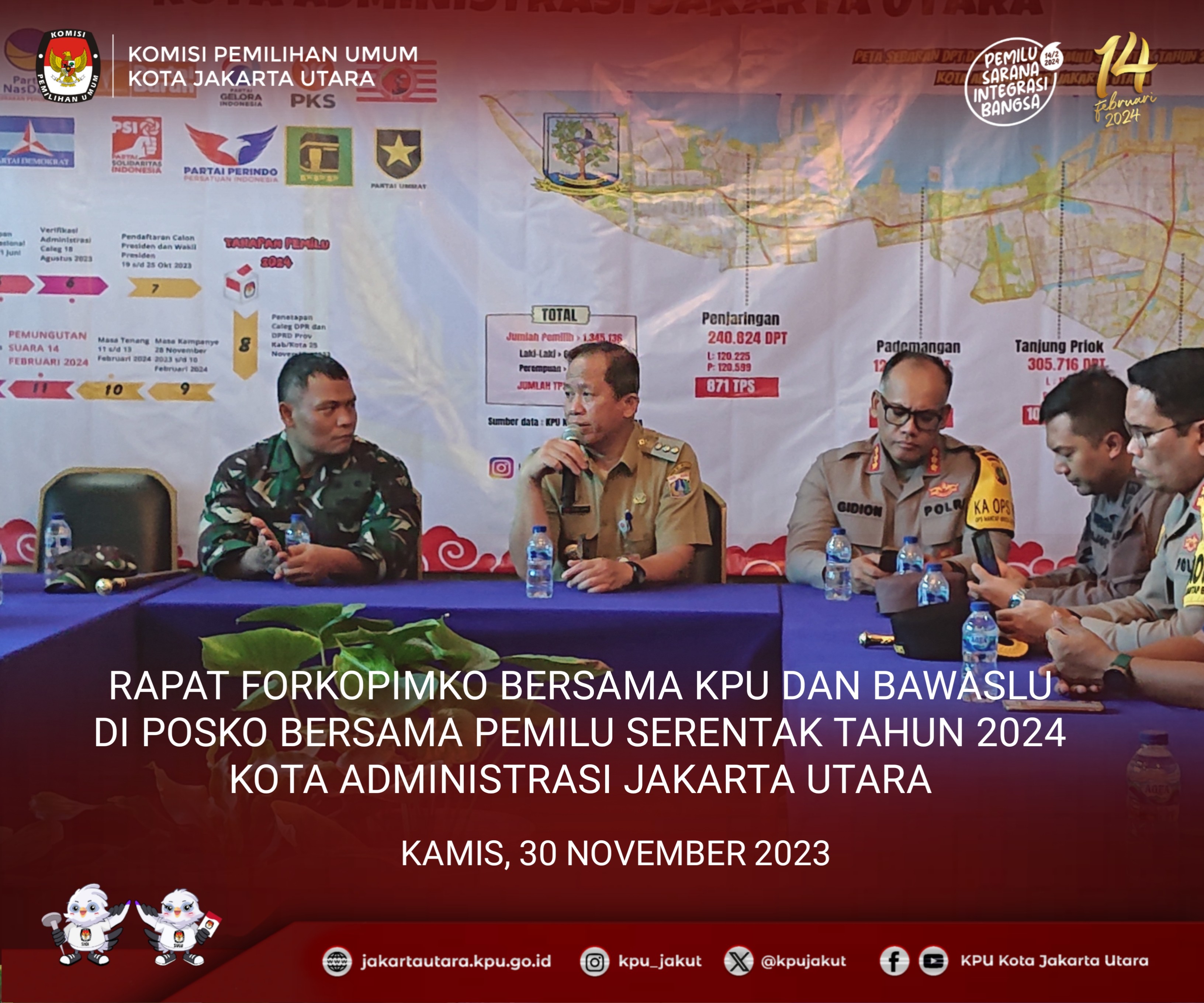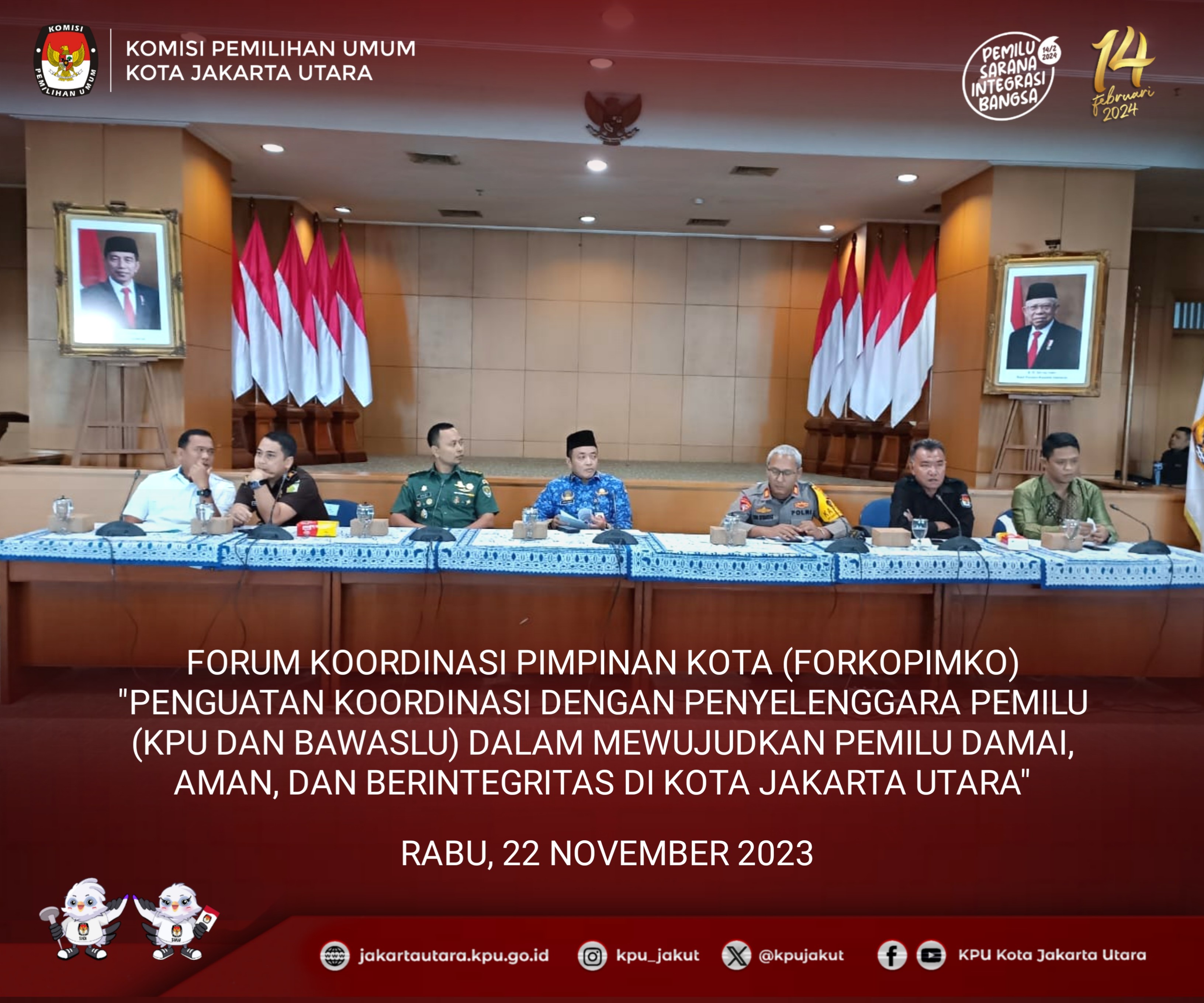 #TemanPemilih KPU Kota Jakarta Utara menghadiri Kegiatan Forum Koordinasi Pimpinan Kota (FORKOPIMKO) dengan tema "Penguatan Koordinasi dengan Penyelenggara Pemilu (KPU dan Bawaslu) dalam Mewujudkan Pemilu Damai, Aman dan Berintegritas di Kota Jakarta Utara.