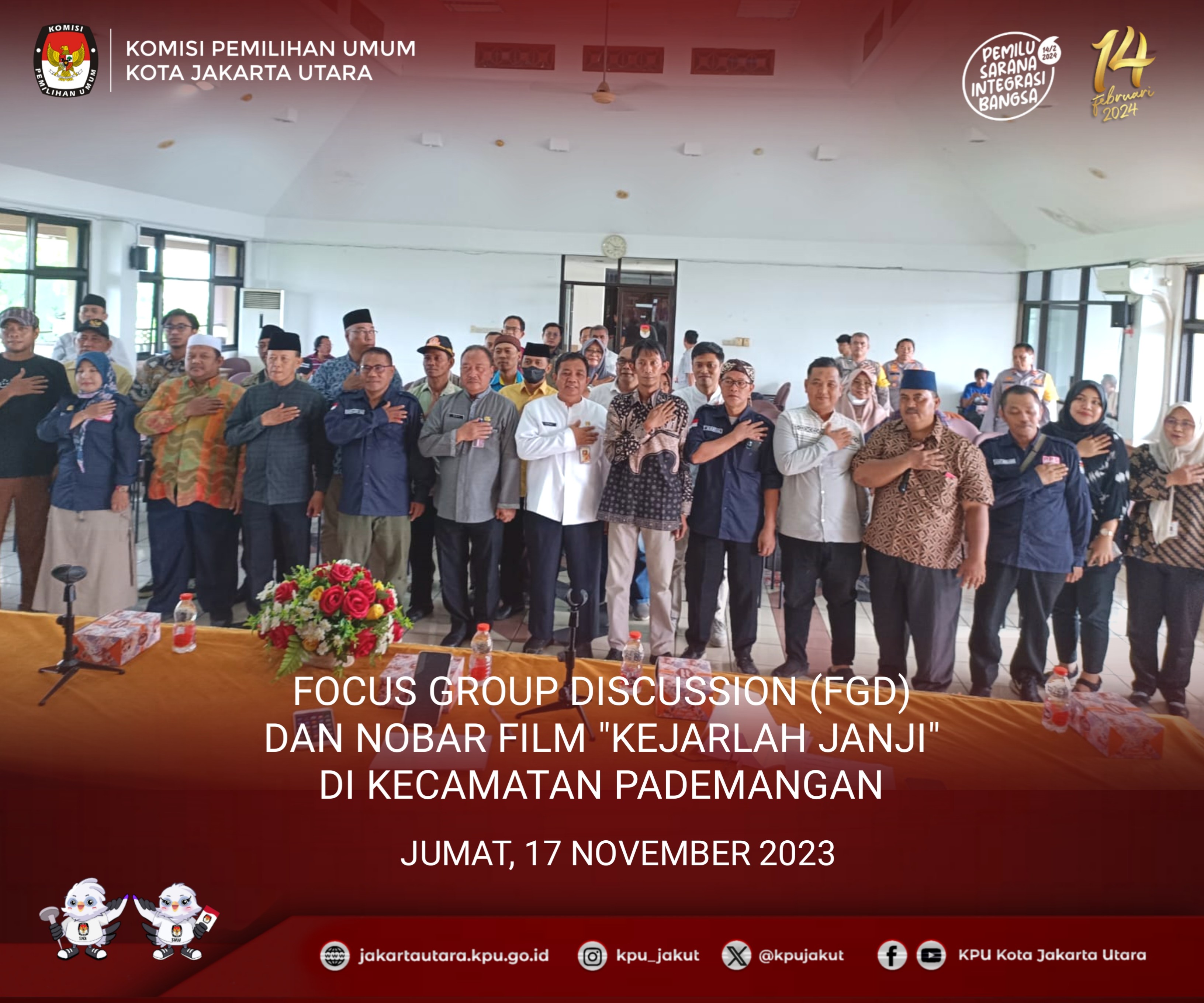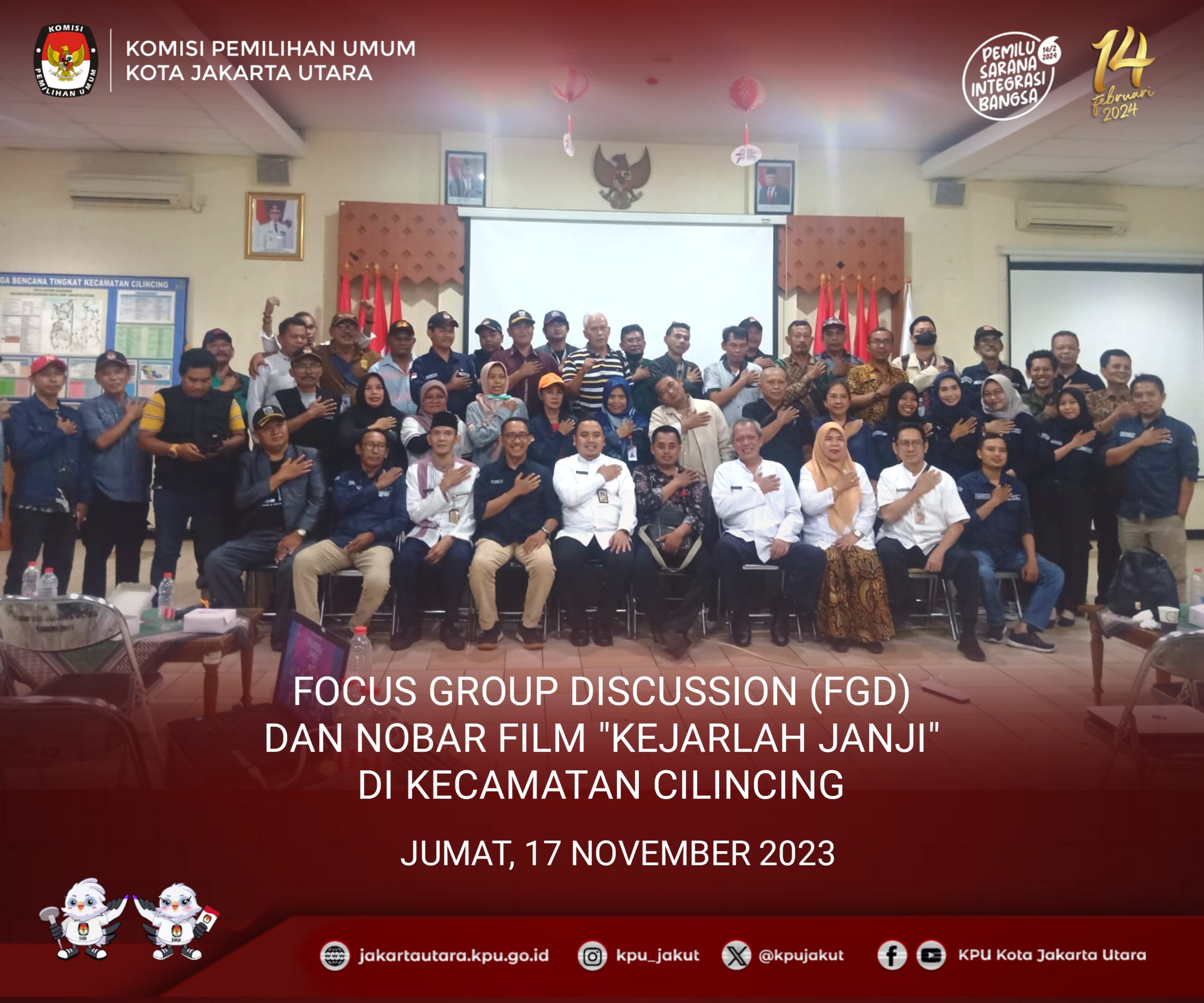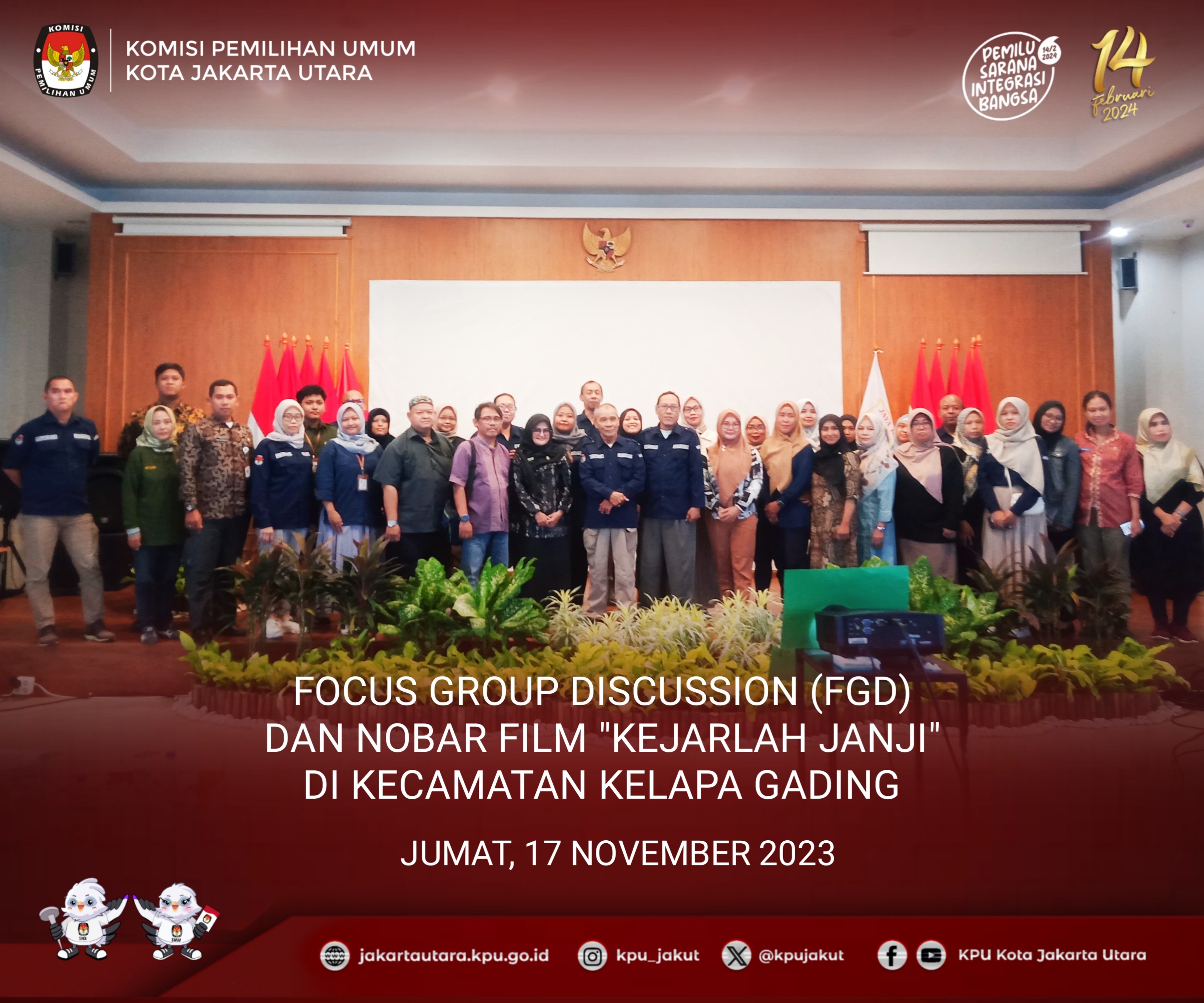 #TemanPemilih KPU Kota Jakarta Utara pada Hari Kamis 17 November 2023 menghadiri kegiatan Forum Group Discussion (FGD) dan Nobar Film “Kejarlah Janji” bersama PPK, PPS, Ormas/OKP dan tokoh masyarakat di Aula lantai 5, Kecamatan Kelapa gading, Kota Jakarta Utara. Sambutan pertama disampaikan oleh Sekretaris Kecamatan Kelapa Gading Ibu Suci Cintya Polaputri menyampaikan bahwa Pemilu dilaksanakan 5 tahun sekali, akan banyak rangkaian Pemilihan Presiden, Pemilihan Legislatif, dan Pemilihan Gubernur yang kita lalui. Untuk itu kita semua berkomitmen atas inisiasi oleh MUI, FKUB, Ormas, Tokoh Agama, dan seluruh elemen masyarakat bahwa kita siap melaksanakan Pemilu Damai 2024. Kita usahakan harmonisasi perbedaan yang ada, sehingga tidak terjadi konflik apapun. Selanjutnya sambutan dari Bpk. Ibnu Affan selaku Anggota KPU Kota Jakarta Utara, beliau menyampaikan bahwa Pemilu dapat berjalan dengan baik dan lancar selama kita bisa berkoordinasi dengan baik. Kelapa gading mrepresentasikan warga di DKI Jakarta. Kami berharap Pengurus RT, RW, Dasawisma untuk dapat mensosialisasikan Daftar Pemilih Tambahan (DPTb) agar warga masyarakat terpenuhi hak pilihnya. Pemilu adalah hak konstitusional warga negara dan ini adalah tanggung jawab kami sebagai penyelenggara Pemilu. 85 hari lagi Pemilu akan dilaksanakan, jangan sampai hak pilih warga tidak dapat terealisasikan. Acara dilanjutkan dengan Nobar Film "Kejarlah Janji" sampai selesai. #KPUMelayani #PemiluSerentak2024