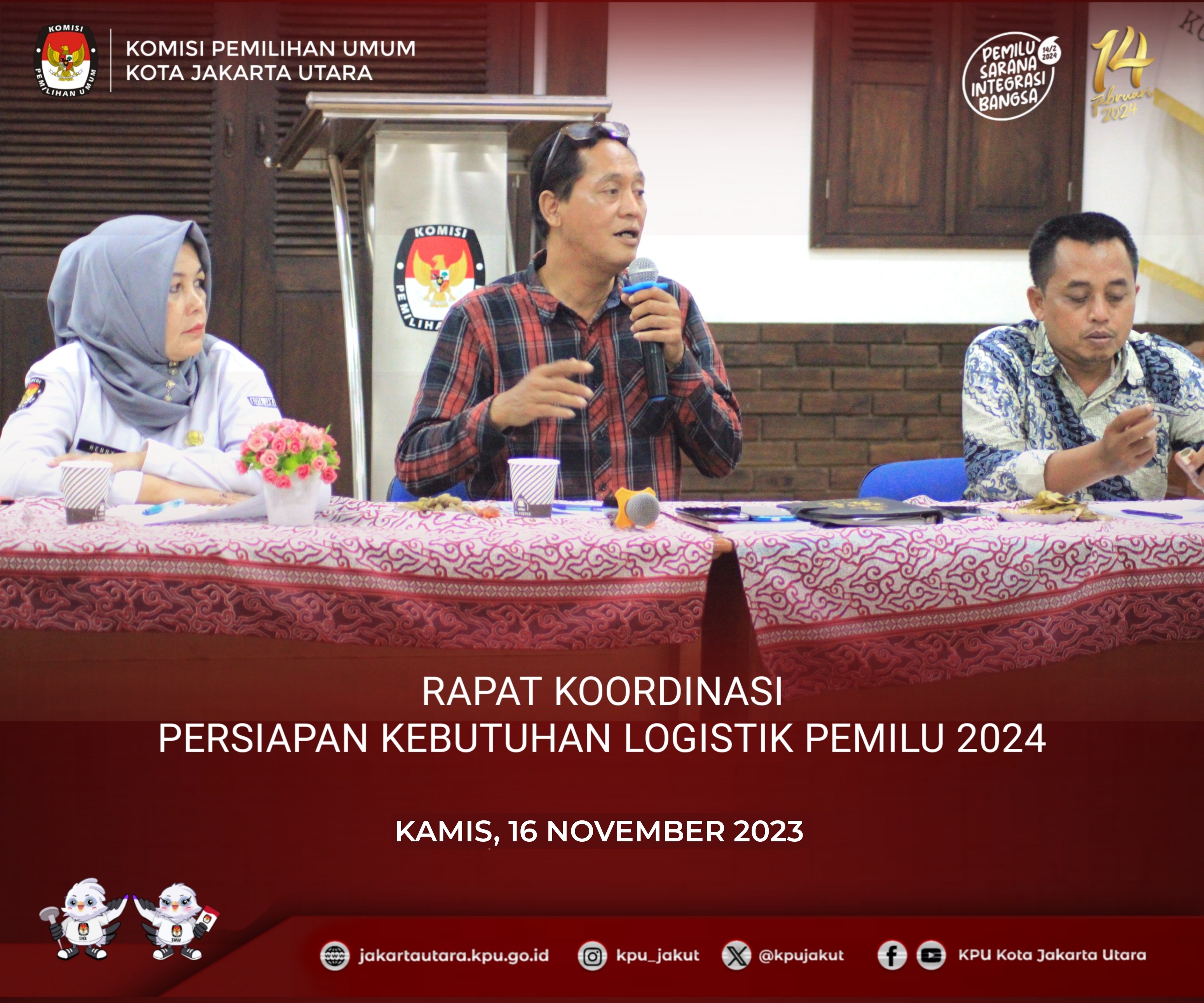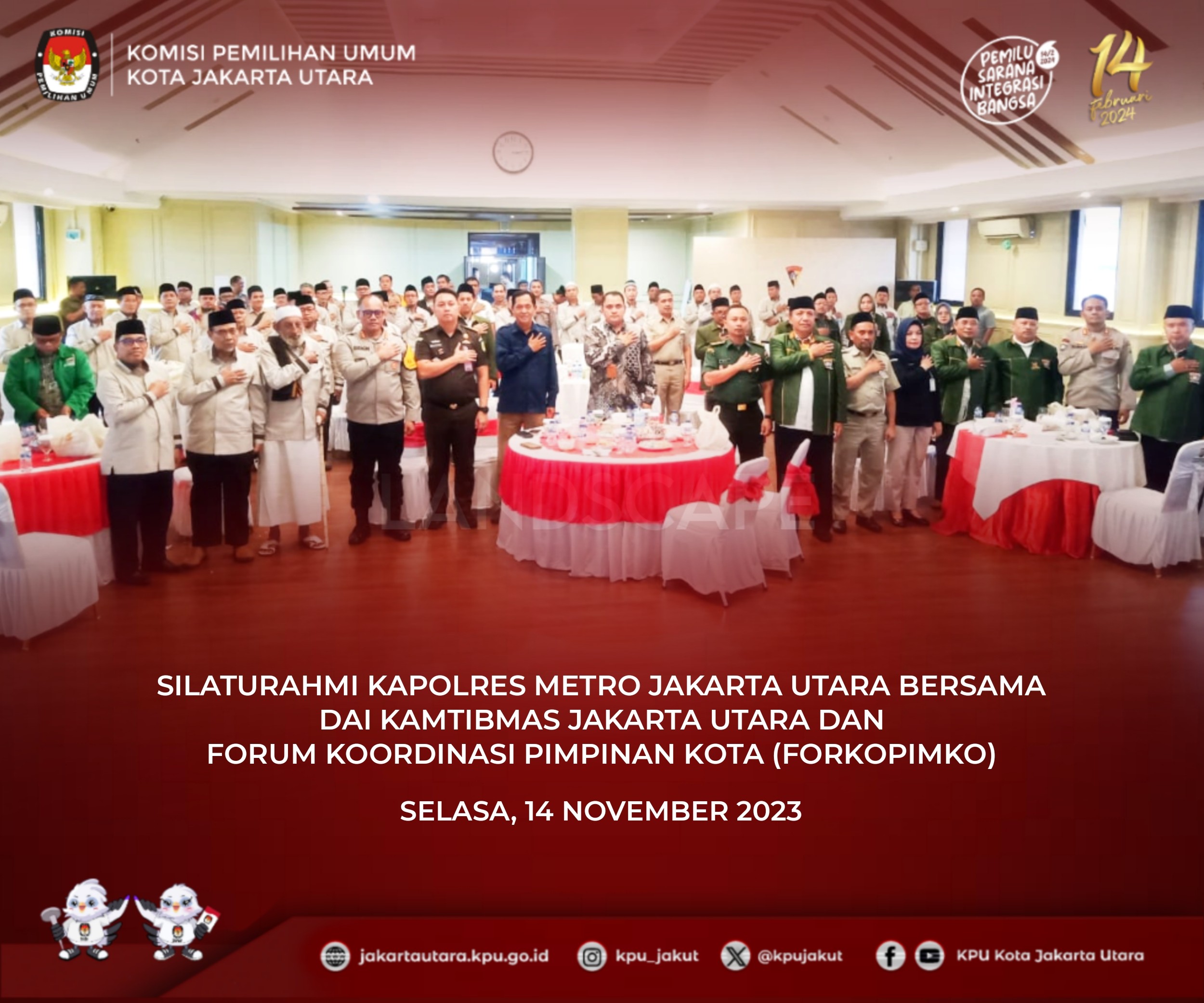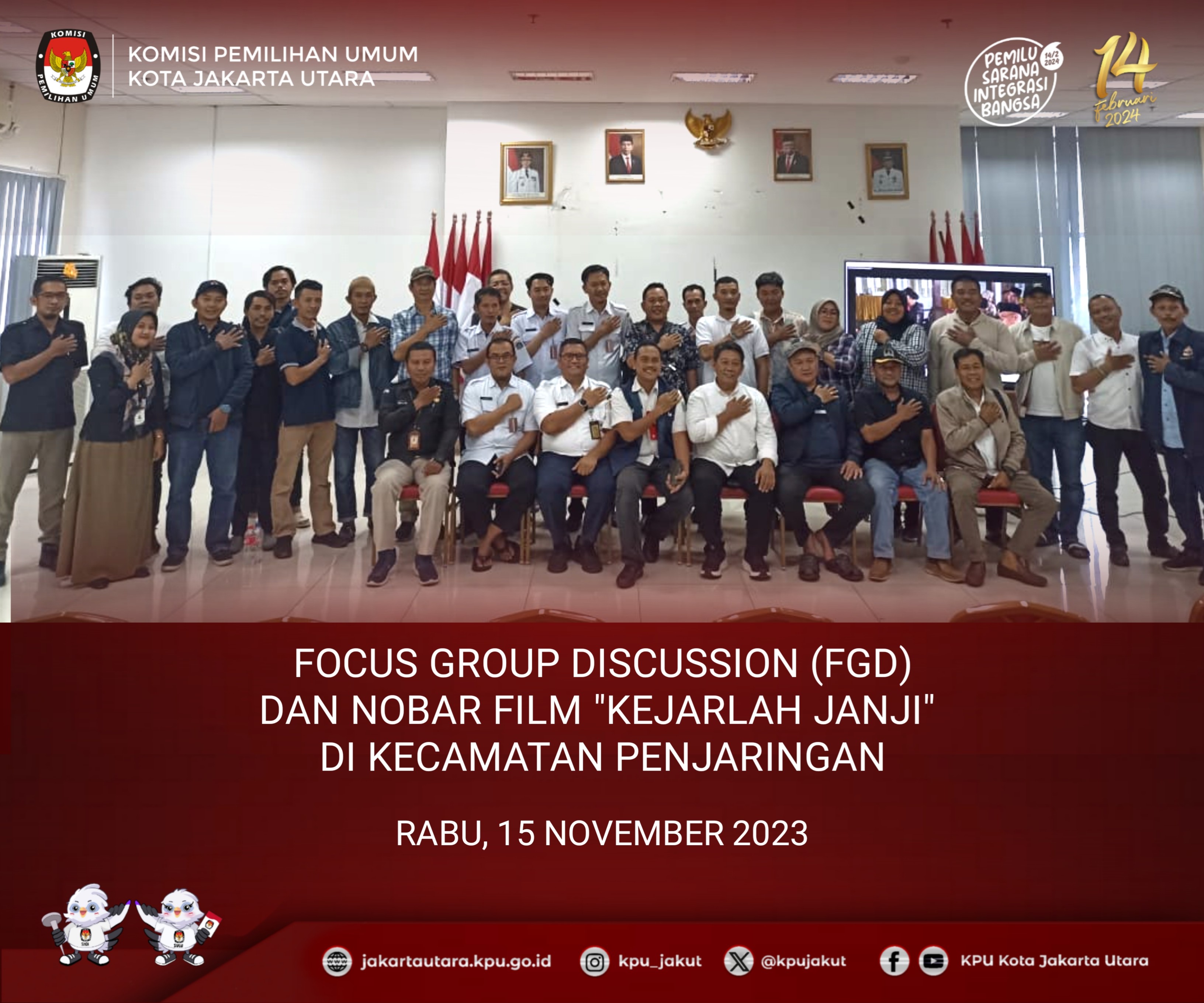 #TemanPemilih KPU Kota Jakarta Utara pada Hari Kamis 17 November 2023 menghadiri kegiatan Forum Group Discussion (FGD) dan Nobar Film “Kejarlah Janji” bersama PPK, PPS, Ormas/OKP dan tokoh masyarakat di Aula lantai 5, Kecamatan Kelapa gading, Kota Jakarta Utara. Sambutan pertama disampaikan oleh Sekretaris Kecamatan Kelapa Gading Ibu Suci Cintya Polaputri menyampaikan bahwa Pemilu dilaksanakan 5 tahun sekali, akan banyak rangkaian Pemilihan Presiden, Pemilihan Legislatif, dan Pemilihan Gubernur yang kita lalui. Untuk itu kita semua berkomitmen atas inisiasi oleh MUI, FKUB, Ormas, Tokoh Agama, dan seluruh elemen masyarakat bahwa kita siap melaksanakan Pemilu Damai 2024. Kita usahakan harmonisasi perbedaan yang ada, sehingga tidak terjadi konflik apapun. Selanjutnya sambutan dari Bpk. Ibnu Affan selaku Anggota KPU Kota Jakarta Utara, beliau menyampaikan bahwa Pemilu dapat berjalan dengan baik dan lancar selama kita bisa berkoordinasi dengan baik. Kelapa gading mrepresentasikan warga di DKI Jakarta. Kami berharap Pengurus RT, RW, Dasawisma untuk dapat mensosialisasikan Daftar Pemilih Tambahan (DPTb) agar warga masyarakat terpenuhi hak pilihnya. Pemilu adalah hak konstitusional warga negara dan ini adalah tanggung jawab kami sebagai penyelenggara Pemilu. 85 hari lagi Pemilu akan dilaksanakan, jangan sampai hak pilih warga tidak dapat terealisasikan. Acara dilanjutkan dengan Nobar Film "Kejarlah Janji" sampai selesai. #KPUMelayani #PemiluSerentak2024